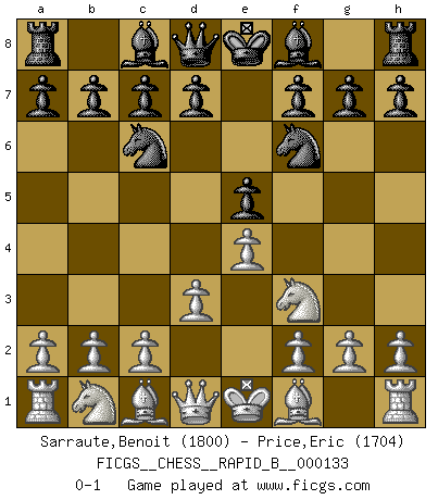 Last move : 0-1 2010 January 15 8:17:0 [Event "FICGS__CHESS__RAPID_B__000133"] [Site "FICGS"] [Date "2009.12.09"] [Round "1"] [White "Sarraute,Benoit"] [Black "Price,Eric"] [Result "0-1"] [WhiteElo "1800"] [BlackElo "1704"] 1.e4 e5 2.d3 Nf6 3.Nf3 Nc6 0-1 This chess game has been lost on time (started : 2009.12.09 18:32:11) Variation Indian Opening : Indian Opening Player Black won this chess game. Follow this game move after move (download)Chess problems demand from the composer the same virtues that characterize all worthwhile art: originality, invention, conciseness, harmony, complexity, and splendid insincerity. (Vladimir Nabokov) Fallen sollten polizeilich verboten werden. (Savielly Grigorievitsch Tartakower) Mi estilo es algo parecido entre un poco de Tal y Petrosian. (Reshevsky) Votre seul travail dans les ouvertures est d'obtenir un milieu de partie jouable. (Lajos Portish) A proverb is a short sentence based on long experience. (Miguel de Cervantes)