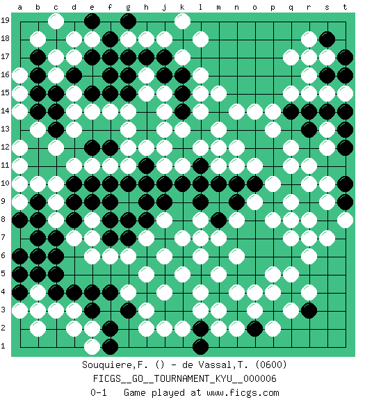 Last move : 0-1 2007 January 9 21:13:32 [Event "FICGS__GO__TOURNAMENT_KYU__000006"] [Site "FICGS"] [Date "2006.10.07"] [Round "1"] [Black "Souquiere,Florence"] [White "de Vassal,Thibault"] [Result "0-1"] [Rating 2 "0600"] 1.d4 r4 2.k4 d17 3.o6 d11 4.q10 q17 5.r14 l16 6.b6 c8 7.c7 o4 8.p4 p5 9.q4 q5 10.p3 o3 11.o2 n2 12.r3 p2 13.g3 j11 14.o5 q3 15.n5 p14 16.d8 q12 17.o10 r11 18.j9 r8 19.q8 n11 20.l9 c9 21.f10 f11 22.g10 g11 23.k10 k11 24.n10 o11 25.m10 m11 26.h6 c3 27.e4 d3 28.e10 e11 29.e12 e14 30.q6 r6 31.r7 s7 32.r9 q7 33.s8 r7 34.p6 s9 35.t9 t8 36.p7 r10 37.d10 c10 38.d9 q9 39.p9 p8 40.o8 q8 41.s16 s17 42.n3 m2 43.h17 h15 44.r17 r16 45.t17 r18 46.k12 l12 47.s18 r17 48.t10 s12 49.t12 s13 50.m14 l14 51.c11 c12 52.c4 b4 53.b3 b2 54.b11 b10 55.j10 k17 56.f18 e18 57.k18 l18 58.e17 e16 59.f17 d18 60.g17 j18 61.j16 j15 62.g15 g14 63.f15 f14 64.e15 d15 65.f16 h16 66.j19 k19 67.h19 h18 68.g19 g18 69.h11 h12 70.h10 k2 71.j17 f19 72.a10 a9 73.a8 a11 74.b12 b13 75.l11 l10 76.a13 a12 77.l11 j12 78.l10 k13 79.h14 j14 80.a4 a3 81.b5 b3 82.d16 c16 83.e3 e2 84.c15 d14 85.f8 h2 86.j3 j2 87.l2 l3 88.k3 n4 89.m4 l4 90.p3 p4 91.l5 m3 92.p11 h3 93.h4 k5 94.k6 j4 95.p12 m5 96.j5 l6 97.l7 n6 98.o7 g4 99.c14 h5 100.n7 j6 101.j7 k7 102.g19 h7 103.m12 n12 104.n13 m13 105.o12 m12 106.e19 m7 107.m6 l8 108.h13 g13 109.g7 g6 110.m8 l7 111.b8 e6 112.h8 j8 113.c6 d7 114.c5 g9 115.c13 g8 116.f7 f6 117.h9 e8 118.f9 e7 119.f2 e1 120.f1 d2 121.b14 a14 122.b16 c17 123.c18 b18 124.b17 c19 125.l1 n6 126.n9 q11 127.k15 p10 128.g16 o9 129.f4 n8 130.g8 n14 131.t14 s15 132.t16 t15 133.o13 o14 134.s14 r15 135.r13 s10 136.k14 j13 137.k16 m15 138.f12 g12 139.b15 l15 140.e9 d13 141.t13 p13 142.a5 a7 143.q14 q15 144.a6 a15 145.b7 a16 146.b9 a10 0-1 Here are the names of the openings (joseki) played in the four corners : Corner q4 : r4 o6 Komoku (Somok, Xiao~mu`) 3-4 Point. The komoku (3-4) point is the traditional corner enclosure move.. Corner q16 : q17 r14 Komoku (Somok, Xiao~mu`) 3-4 Point. The komoku (3-4) point is the traditional corner enclosure move.. Nikken Kakari (Dukan Keolch'im, E`r Gua`jiao~, 2-Space Low Approach). Black 2 is used with friendly forces backing it up. Its purpose is to prevent a pincer. Locally it results in a loss, but may be appropriate fuseki strategy. It was popular in the late 1950s and early 1960s, but is not seen often nowadays, having been replaced by the one-space high approach, with which it has points in common. Player White won this Go (weiqi, baduk) game. Follow this game move after move (download)To invade, need 20 points in open area; otherwise, keshi is best. (Yang Yilun, 7p) Imagination is more important than knowledge. Knowledge is limited. Imagination encircles the world. (Albert Einstein)
