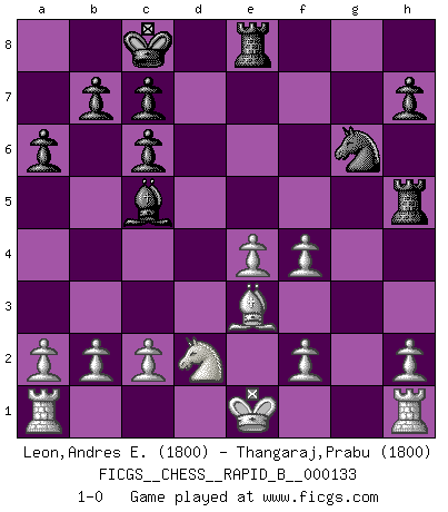 Last move : 1-0 2010 February 28 21:35:42 [Event "FICGS__CHESS__RAPID_B__000133"] [Site "FICGS"] [Date "2009.12.09"] [Round "1"] [White "Leon,Andres E."] [Black "Thangaraj,Prabu"] [Result "1-0"] [WhiteElo "1800"] [BlackElo "1800"] 1.e4 e5 2.Nf3 Nc6 3.Bb5 a6 4.Bxc6 dxc6 5.d4 Bg4 6.dxe5 Qxd1+ 7.Kxd1 O-O-O 8.Ke1 f6 9.Bf4 fxe5 10.Bxe5 Ne7 11.Bc3 Ng6 12.Nbd2 Bc5 13.Bxg7 Rhe8 14.Bf6 Rd6 15.Bg5 Bxf3 16.gxf3 Rd5 17.Be3 Rh5 18.f4 1-0 Ruy Lopez : Exchange variation Queenside Castling by player Black (move 7) Player White won this chess game. Follow this game move after move (download)Chess is mental torture. (Garry Kasparov) Der vorletzte Fehler gewinnt. (Savielly Grigorievitsch Tartakower) El estómago es una parte esencial del maestro de Ajedrez. (Bent Larsen) D'abord les bases : Jouez et étudiez, puis étudiez et jouez, ensuite jouez et étudiez, puis étudiez et jouez. Deuxièmement : Donnez toujours le meilleur de vous-même ! (Ken Smith) Methinks King Thibault should dub Marius Zubac a knight of the square board... I mean table, henceforth addressing him as Sir Marius, and bestow on him a suitable land from the kingdom of FICGS & marry him off to a worthy, fair maiden, lest he slice our heads with his mighty sword in his wrath. (Dinesh De Silva)