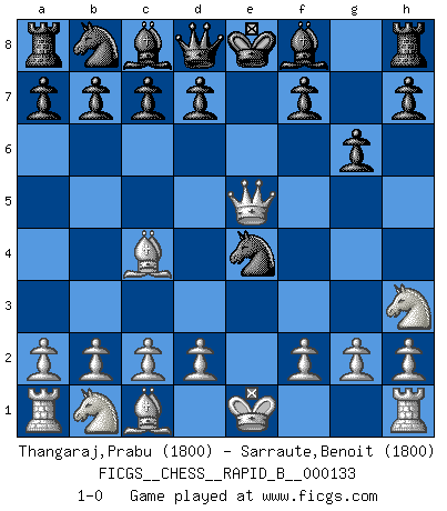 Last move : 1-0 2010 January 16 20:19:26 [Event "FICGS__CHESS__RAPID_B__000133"] [Site "FICGS"] [Date "2009.12.09"] [Round "1"] [White "Thangaraj,Prabu"] [Black "Sarraute,Benoit"] [Result "1-0"] [WhiteElo "1800"] [BlackElo "1800"] 1.e4 e5 2.Bc4 Nf6 3.Nh3 Nxe4 4.Qh5 g6 5.Qxe5+ 1-0 This chess game has been lost on time (started : 2009.12.09 18:32:11) Bishop's Opening : Berlin defense Player White won this chess game. Follow this game move after move (download)Half the variations which are calculated in a tournament game turn out to be completely superfluous. Unfortunately, no one knows in advance which half. (Jan Tinman) Deine Wertungszahl - vorausgesetzt einige Jahre schachliche Anstrengung - entspricht etwa dem zehnfachen Deines IQ plus 1000. (Jonathan Levitt) Todo lo que importa ante el tablero de Ajedrez son buenas jugadas. (Bobby Fischer) Les échecs sont un jeu par leur forme, un art par leur essence et une science par sa difficulté d'acquisition. Ils peuvent vous procurer autant de plaisir qu'un bon livre ou une belle musique, mais vous n'aurez une réelle joie que si vous arrivez à bien jouer. (Tigran Petrosian) A woman without a man is like a fish without a bicycle. (Gloria Steinem)