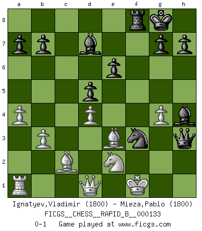 Last move : 0-1 2009 December 16 1:20:16 [Event "FICGS__CHESS__RAPID_B__000133"] [Site "FICGS"] [Date "2009.12.09"] [Round "1"] [White "Ignatyev,Vladimir"] [Black "Mieza,Pablo"] [Result "0-1"] [WhiteElo "1800"] [BlackElo "1800"] 1.e4 c5 2.f4 e6 3.c3 Nc6 4.Bd3 d5 5.e5 Be7 6.Nf3 Nh6 7.O-O O-O 8.h3 Qb6 9.Bc2 f6 10.d3 fxe5 11.fxe5 Bd7 12.g4 Nf7 13.d4 cxd4 14.cxd4 Nfxe5 15.Nxe5 Nxe5 16.Nc3 Rxf1+ 17.Kxf1 Rf8+ 18.Kg2 Nf3 19.Ne2 Bh4 20.b3 Ne1+ 21.Kg1 Qd6 22.a4 Nf3+ 23.Kf1 Qh2 24.Be3 Qxh3+ 0-1 Sicilian : Grand Prix attack Kingside Castling by player White (move 7) Kingside Castling by player Black (move 7) Player Black won this chess game. Follow this game move after move (download)When you are lonely, when you feel yourself an alien in the world, play Chess. This will raise your spirits and be your counselor in war. (Aristotle) Alles was am Schachbrett zählt sind gute Züge. (Robert James Fischer) Es muy difícil jugar en contra de la teoría de Einstein. - en su primera derrota en contra de Fischer (Mikhail Tal) Les Echecs mettent en conflit, non pas deux intelligences, mais deux volontés. (Lasker) The existence of forgetting has never been proved: We only know that some things don't come to mind when we want them. (Friedrich Nietzsche)