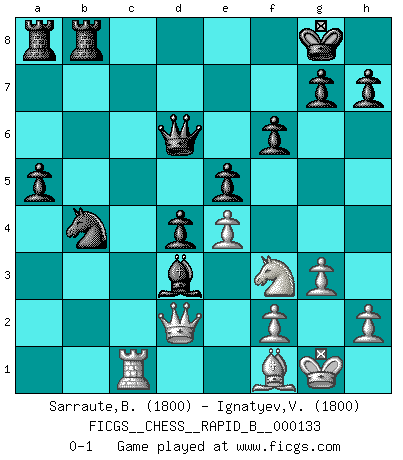 Last move : 0-1 2010 February 7 8:23:55 [Event "FICGS__CHESS__RAPID_B__000133"] [Site "FICGS"] [Date "2009.12.09"] [Round "1"] [White "Sarraute,Benoit"] [Black "Ignatyev,Vladimir"] [Result "0-1"] [WhiteElo "1800"] [BlackElo "1800"] 1.d3 d5 2.e3 e5 3.g3 c5 4.c3 Bd6 5.Bg2 Ne7 6.e4 d4 7.c4 O-O 8.Nf3 Nbc6 9.O-O a6 10.a3 b5 11.Bd2 f6 12.Qe1 Qb6 13.b4 cxb4 14.Bxb4 Nxb4 15.axb4 bxc4 16.Na3 cxd3 17.Rb1 Bd7 18.Nc4 Qc6 19.Nxd6 Qxd6 20.Rd1 Bb5 21.Rb1 Nc6 22.Qd1 Nxb4 23.Qd2 a5 24.Rfc1 Ba4 25.Bf1 Bc2 26.Rb3 Rfb8 27.Rxd3 Bxd3 0-1 This chess game has been lost on time (started : 2009.12.09 18:32:11) Mieses Opening Kingside Castling by player Black (move 7) Kingside Castling by player White (move 9) Player Black won this chess game. Follow this game move after move (download)Not only will I predict his triumph over Botvinnik, but I'll go further and say that he'll probably be the greatest Chess player that ever lived. (John Collins) Wer der Ansicht ist, daß alle Schachspieler verrückt sind, wird durch Studium des Lebens von Emil Josef Diemer nicht auf andere Gedanken kommen. (Hans Ree) El Ajedrez tiene tanto misterio como las mujeres. (Purdy) Même si vous avez un bon coup à faire, regardez toujours s'il n'y en a pas un qui lui soit préférable. (Pedro Damiano) Panic is a sudden desertion of us, an a going over to the enemy of our imagination. (Christian Nevell Bovee)