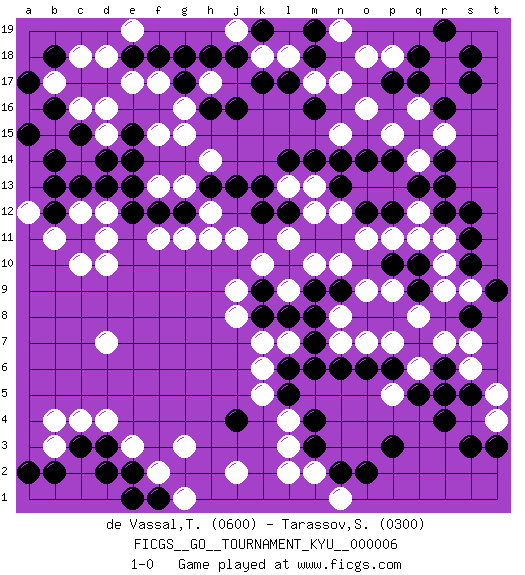 Last move : 1-0 2007 February 20 22:22:50 [Event "FICGS__GO__TOURNAMENT_KYU__000006"] [Site "FICGS"] [Date "2006.10.07"] [Round "1"] [Black "de Vassal,Thibault"] [White "Tarassov,Sergey"] [Result "1-0"] [Rating 1 "0600"] [Rating 2 "0300"] 1.r4 d4 2.p3 d16 3.r16 d10 4.p17 r10 5.j4 r7 6.r13 g3 7.m4 n17 8.j16 g16 9.m16 m17 10.l17 o16 11.o14 n15 12.l14 l18 13.k17 d7 14.p10 p7 15.n9 k10 16.m7 k7 17.d13 f13 18.q9 r9 19.s11 r11 20.s12 q12 21.o12 p15 22.p14 q16 23.q17 q14 24.q13 r5 25.s5 s6 26.q5 t5 27.r6 q6 28.r5 s7 29.c15 c16 30.b16 b17 31.c11 c10 32.b14 b11 33.b12 c12 34.c13 d11 35.a15 d15 36.e12 f11 37.d14 j2 38.g17 k18 39.j18 f17 40.f18 h17 41.g18 e17 42.e18 d18 43.h16 l3 44.m3 l4 45.l5 k5 46.l6 k6 47.l12 q8 48.t9 p9 49.q10 p5 50.s8 s9 51.s10 o9 52.o6 n8 53.m8 n10 54.m9 o11 55.p6 n7 56.n6 o7 57.f12 h12 58.b18 c18 59.a17 g15 60.g12 g11 61.h13 g13 62.e15 f15 63.e14 h14 64.j13 n12 65.n14 r17 66.s17 r18 67.s18 p18 68.q18 o18 69.m19 j19 70.m18 h11 71.c3 c4 72.d3 e3 73.e2 f2 74.d2 b3 75.b2 b4 76.a2 m2 77.n2 t4 78.s3 l2 79.p12 p11 80.k9 j9 81.k8 j8 82.f1 g1 83.e1 a12 84.b13 l11 85.k12 j11 86.t3 m12 87.r12 q11 88.r14 r15 89.r19 l9 90.l8 m10 91.n13 m13 92.m14 l7 93.m6 n1 94.o2 e19 95.h18 n19 96.k19 l13 97.k13 d12 98.e13 1-0 Comment by player 1 : Thibault de Vassal : Thanks for the games Sergey ! Best wishes, Thibault. Here are the names of the openings (joseki) played in the four corners : Corner d4 : d4 j4 Hoshi (Hwajeom, Seongjeom, Xingwei`) 4-4 Point. The star or hoshi (4-4) point, emphasizing influence at the potential expense of territory. Corner d16 : d16 j16 Hoshi (Hwajeom, Seongjeom, Xingwei`) 4-4 Point. The star or hoshi (4-4) point, emphasizing influence at the potential expense of territory. Player Black won this Go (weiqi, baduk) game. Follow this game move after move (download)Stop on second, extend on third. (Anonymous) To err is human, but to really foul things up requires a computer. (Farmer's Almanac, 1978)