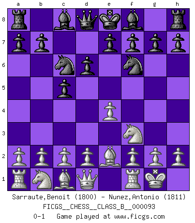 Last move : 0-1 2010 January 24 8:23:55 [Event "FICGS__CHESS__CLASS_B__000093"] [Site "FICGS"] [Date "2009.12.09"] [Round "1"] [White "Sarraute,Benoit"] [Black "Nunez,Antonio"] [Result "0-1"] [WhiteElo "1800"] [BlackElo "1811"] 1.e4 c5 2.Nf3 d6 3.Be2 Nf6 4.O-O Nc6 0-1 This chess game has been lost on time (started : 2009.12.09 20:16:59) Sicilian Kingside Castling by player White (move 4) Player Black won this chess game. Follow this game move after move (download)I have always a slight feeling of pity for the man who has no knowledge of Chess. (Siegbert Tarrasch) Kasparov ist eine Art Monster mit hundert Augen, denen auch nicht das Geringste entgeht. (Tony Miles) La señal de un Gran Maestro es su habilidad de ganar una partida rápidamente y sin dolor. (Irving Chernev) La solitude du joueur d'Echecs à l'approche du mat est semblable à celle du condamné. (Francis Szpiner) If you know the enemy and know yourself you need not fear the results of a hundred battles. (Sun Tzu)