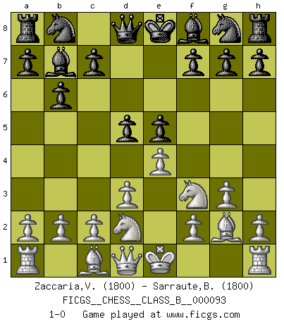 Last move : 1-0 2010 January 22 8:22:16 [Event "FICGS__CHESS__CLASS_B__000093"] [Site "FICGS"] [Date "2009.12.09"] [Round "1"] [White "Zaccaria,Vincenzo"] [Black "Sarraute,Benoit"] [Result "1-0"] [WhiteElo "1800"] [BlackElo "1800"] 1.e4 e5 2.Nf3 d6 3.g3 b6 4.Bg2 Bb7 5.d3 d5 6.Nbd2 1-0 This chess game has been lost on time (started : 2009.12.09 20:16:59) Philidor's defense Player White won this chess game. Follow this game move after move (download)Don't even mention losing to me. I can't stand to think of it. (Bobby Fischer) Ich verachte Kasparow. (Viktor Kortschnoi) Los tropiezos estan todos ahí en el tablero, esperando que se cometan. (Savielly Tartakover) Les Echecs, c'est l'art de la guerre sans les charniers, c'est la résurrection des morts tombés au champ d'honneur, l'espoir perpétuel, la suprématie de l'intelligence sur la force, la culture de l'esprit. (F. Szpiner) War is the child of passion, passion is the child of narcissism and narcissism is the child. (...) Another game ? (Thibault de Vassal)