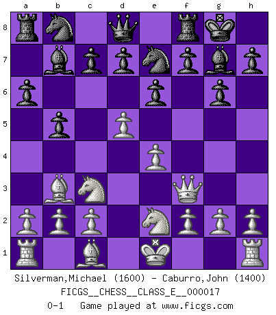 Last move : 0-1 2006 December 9 23:45:41 [Event "FICGS__CHESS__CLASS_E__000017"] [Site "FICGS"] [Date "2006.10.07"] [Round "1"] [White "Silverman,Michael"] [Black "Caburro,John"] [Result "0-1"] [WhiteElo "1600"] [BlackElo "1400"] 1.e4 g6 2.Bc4 Bg7 3.Qf3 e6 4.Nc3 Ne7 5.Nge2 O-O 6.d4 a6 7.d5 b5 8.Bb3 Bb7 0-1 Robatsch (Modern) defense Kingside Castling by player Black (move 5) Player Black won this chess game. Follow this game move after move (download)Every Pawn is a potential Queen. (James Mason) Der Traum, für den ich lebe, ist der von einem freien Russland. Viele mögen sagen: Russland hat doch ein Parlament, einen gewählten Präsidenten. Aber ich spüre, dass in meiner Heimat die Angst wiederkehrt. Eine Angst, sich frei zu äußern, bestimmte Dinge zu tun (Garry Kasparov) Cuando estes solo, cuando te sientas un extraño en el mundo, juega al Ajedrez. Esto levantará tu espiritu y será tu consejero de guerra. (Aristóteles) Les Echecs sont affaire de jugement sensible. Savoir quand frapper et quand esquiver. (Fischer) The production of too many useful things results in too many useless people. (Karl Marx)