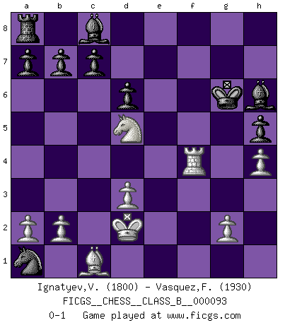 Last move : 0-1 2010 April 22 23:46:37 [Event "FICGS__CHESS__CLASS_B__000093"] [Site "FICGS"] [Date "2009.12.09"] [Round "1"] [White "Ignatyev,Vladimir"] [Black "Vasquez,Fernando"] [Result "0-1"] [WhiteElo "1800"] [BlackElo "1930"] 1.e4 e5 2.f4 exf4 3.Nf3 g5 4.h4 g4 5.Ne5 Qe7 6.Nxg4 f5 7.Nf2 fxe4 8.Qh5+ Kd8 9.Nc3 Nf6 10.Qg5 Bg7 11.Qxf4 h6 12.Be2 Nc6 13.Nfxe4 Nxe4 14.Qxe4 Qxe4 15.Nxe4 Re8 16.d3 Nd4 17.Bh5 Nxc2+ 18.Kd2 Nxa1 19.Bxe8 Kxe8 20.Nc3 d6 21.Re1+ Kf7 22.Re4 h5 23.Rf4+ Kg6 24.Nd5 Bh6 0-1 KGA : Kieseritsky, Salvio (Rosenthal) defense Player Black won this chess game. Follow this game move after move (download)Chess teaches you to control the initial excitement you feel when you see something that looks good and it trains you to think objectively when you're in trouble. (Stanley Kubrick) Ohne ihre Erfolge schmälern zu wollen würde ich sagen Petrosian, Spassky und Karpov verdanken ihre Siege ihren Trainern - Boleslavsky, Bondarevsky und Furman. (Mikhail Moiseyevich Botvinik) Desconfianza es la característica mas necesaria de un jugador de Ajedrez. (Siegbert Tarrasch) J'ai vu le vaincu d'Echecs jouer des années durant dans l'espoir de la fête de la victoire. Car tu es plus riche de ce qu'elle existe si même elle n'est point pour toi. Ainsi de la perle du fond des mers. (Antoine de Saint-Exupéry) Imagination is more important than knowledge. Knowledge is limited. Imagination encircles the world. (Albert Einstein)
