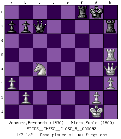 Last move : 1/2-1/2 2010 July 17 19:22:32 [Event "FICGS__CHESS__CLASS_B__000093"] [Site "FICGS"] [Date "2009.12.09"] [Round "1"] [White "Vasquez,Fernando"] [Black "Mieza,Pablo"] [Result "1/2-1/2"] [WhiteElo "1930"] [BlackElo "1800"] 1.e4 c5 2.d4 cxd4 3.c3 dxc3 4.Nxc3 Nc6 5.Nf3 Nf6 6.Bc4 e6 7.O-O Nxe4 8.Nxe4 d5 9.Qe2 dxc4 10.Rd1 Qc7 11.Nd4 Nxd4 12.Rxd4 Bd7 13.Bg5 h6 14.Bh4 Bc6 15.Rad1 Be7 16.Bxe7 Qxe7 17.Nd6+ Kf8 18.Nxc4 f6 19.Qd3 Kg8 20.a3 Rf8 21.Re1 e5 22.Na5 Be8 23.Rd6 Rh7 24.Qd5+ Bf7 25.Qd2 Be8 26.f4 Qc7 27.fxe5 fxe5 28.Rxe5 g5 29.h3 Re7 30.Qd4 Rf4 31.Qe3 R4f7 32.Nc4 Bb5 33.Rg6+ Kh7 34.Rxh6+ Kxh6 35.Qxg5+ Kh7 36.Qh4+ Kg8 37.Rxb5 Rf8 38.Rg5+ Rg7 39.Rh5 Rh7 1/2-1/2 Sicilian : Smith-Morra gambit Kingside Castling by player White (move 7) This chess game ended in a draw. Follow this game move after move (download)I have added these principles to the law: get the Knights into action before both Bishops are developed. (Emanuel Lasker) Computer sind die einzigen Gegner, die nicht immer eine Ausrede auf Lager haben, wenn sie gegen mich verlieren. (Robert James Fischer) Yo no le temo a Spassky. Todos saben que yo soy el mejor. Uno no necesita un torneo para probarlo. (Bobby Fischer) Même si vous avez un bon coup à faire, regardez toujours s'il n'y en a pas un qui lui soit préférable. (Pedro Damiano) Question: Is 'This statement is paradoxical' a paradoxical statement ? Or is it a meta-paradox ? (Normajean Yates)