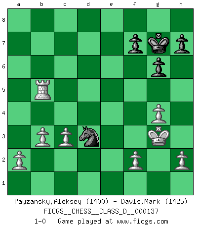 Last move : 1-0 2010 January 8 15:41:50 [Event "FICGS__CHESS__CLASS_D__000137"] [Site "FICGS"] [Date "2009.12.12"] [Round "1"] [White "Payzansky,Aleksey"] [Black "Davis,Mark"] [Result "1-0"] [WhiteElo "1400"] [BlackElo "1425"] 1.e4 c5 2.Nf3 Nc6 3.d4 cxd4 4.Nxd4 g6 5.Nc3 Bg7 6.Be3 e6 7.Be2 Nge7 8.O-O O-O 9.Qd2 d5 10.exd5 exd5 11.Rad1 Re8 12.Bf3 Nxd4 13.Bxd4 Nf5 14.Bxg7 Nxg7 15.Qxd5 Qxd5 16.Nxd5 Rb8 17.Nf6+ Kf8 18.Nxe8 Kxe8 19.Rfe1+ Be6 20.g4 Kf8 21.Kg2 Ne8 22.Kg3 Kg7 23.Bd5 Bxd5 24.Rxd5 Nf6 25.Rc5 Re8 26.Rxe8 Nxe8 27.Rc8 Nd6 28.Rd8 Nc4 29.b3 Na5 30.Rd7 a6 31.c3 b5 32.Ra7 Nc6 33.Rxa6 Ne5 34.Ra5 Nd3 35.Rxb5 1-0 Sicilian : Accelerated Fianchetto, Modern variation Kingside Castling by player White (move 8) Kingside Castling by player Black (move 8) Player White won this chess game. Follow this game move after move (download)Chess, like any creative activity, can exist only through the combined efforts of those who have creative talent, and those who have the ability to organize their creative work. (Mikhail Botvinnik) Wir irren allesamt, nur jeder irrt anders. (Georg Christoph Lichtenberg) Al jugar al Ajedrez entonces, podemos aprender: Primero: Previsión... Segundo: Prudencia... Tercero: Cautela... Y al final, aprendemos del Ajedrez el hábito de no ser desanimados por apariencias malas presentes en el estado de nuestros asuntos, el hábito de la esperanza por una oportunidad favorable y la perseveración de los secretos de los recursos. (Benjamin Franklin) Les échecs sont utiles à l'exercice de la faculté de penser et à celle de l'imagination. Car nous devons posséder une méthode élaborée pour atteindre des buts partout où nous devons conduire notre raison. (Leibnitz) The project of the man are lower than those of the sky. (Chinese proverb)