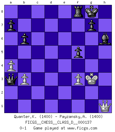 Last move : 0-1 2009 December 14 23:51:1 [Event "FICGS__CHESS__CLASS_D__000137"] [Site "FICGS"] [Date "2009.12.12"] [Round "1"] [White "Quanter,Kirsty"] [Black "Payzansky,Aleksey"] [Result "0-1"] [WhiteElo "1400"] [BlackElo "1400"] 1.Nf3 Nf6 2.c3 d5 3.d4 e6 4.Bg5 Be7 5.e3 O-O 6.a4 c5 7.b3 b6 8.Bd3 h6 9.Bxf6 Bxf6 10.h4 Nc6 11.Nfd2 cxd4 12.cxd4 Nb4 13.Qe2 e5 14.g4 e4 15.Nxe4 Nxd3+ 16.Qxd3 dxe4 17.Qxe4 Be6 18.g5 Bd5 19.Qg4 Bxh1 20.f3 hxg5 21.hxg5 Bxg5 22.Ra2 f5 23.Qh3 Rc8 24.Na3 Bxe3 25.Rh2 Bh6 26.Rxh1 Rc1+ 27.Kf2 Rxh1 28.Qxh1 Qxd4+ 29.Kg2 Qb2+ 30.Kg3 Qxa3 0-1 Reti Opening Kingside Castling by player Black (move 5) Player Black won this chess game. Follow this game move after move (download)Nothing excites jaded Grandmasters more than a theoretical novelty. (Dominic Lawson) Versuche, dich von der Sklaverei der Eröffnungsvarianten zu befreien. Stattdessen soll man gewisse Typenpositionen erlernen, die man eingehend analysiert. (Aaron Nimzowitsch) El jugador táctico sabe que hacer cuando hay algo que hacer; mientras que el estratega sabe que hacer cuando no hay nada que hacer. (Gerald Abrahams) Avant la finale, les dieux ont créé le milieu de partie. (Tarrasch) There is a great deal of difference between an eager man who wants to read a book and a tired man who wants a book to read. (G.K. Chesterton)