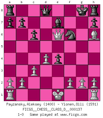 Last move : 1-0 2009 December 25 15:37:55 [Event "FICGS__CHESS__CLASS_D__000137"] [Site "FICGS"] [Date "2009.12.12"] [Round "1"] [White "Payzansky,Aleksey"] [Black "Ylonen,Olli"] [Result "1-0"] [WhiteElo "1400"] [BlackElo "1591"] 1.e4 c6 2.d4 d5 3.Nc3 Nf6 4.e5 Ne4 5.Nxe4 dxe4 6.Bc4 Bf5 7.Ne2 e6 8.Ng3 Nd7 9.c3 Be7 10.Nxf5 exf5 11.e6 fxe6 12.Bxe6 g6 13.Bxf5 gxf5 14.Qh5+ Kf8 15.Bh6+ Kg8 16.Qxf5 Nf6 17.Qe6+ 1-0 Caro-Kann defense Player White won this chess game. Follow this game move after move (download)The King is a fighting piece. Use it ! (Wilhelm Steinitz) Ein Teil des Fehlers ist immer korrekt. (Savielly Grigorievitsch Tartakower) Yo no creo en la psicología. Yo creo en las buenas movidas. (Bobby Fischer) Seul un grand joueur sait à quel point il joue faiblement. (Xavier Tartacover) We need strong personalities and only one world champion to attract sponsors. (Anatoly Karpov)