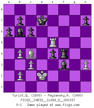 Last move : 0-1 2009 December 17 16:43:24 [Event "FICGS__CHESS__CLASS_D__000137"] [Site "FICGS"] [Date "2009.12.12"] [Round "1"] [White "Turlot,Quentin"] [Black "Payzansky,Aleksey"] [Result "0-1"] [WhiteElo "1600"] [BlackElo "1400"] 1.d4 Nf6 2.g3 g6 3.Bg2 Bg7 4.Nf3 O-O 5.Nc3 d5 6.O-O c6 7.Ne5 Nbd7 8.e4 Nxe5 9.dxe5 Nxe4 10.Nxe4 dxe4 11.Be3 Bxe5 12.c3 f5 13.Qb3+ Qd5 14.Rfd1 Qxb3 15.axb3 Be6 16.b4 Rfd8 17.f4 Bf6 18.Rd2 Rxd2 19.Bxd2 Rd8 20.Be3 a6 21.Bf1 Kf7 22.Be2 Bb3 23.Kf2 e5 24.fxe5 Bxe5 25.Ra5 Ke6 26.Ra1 Bf6 27.Ra5 g5 28.Ra3 Bd1 29.Bc4+ Kd7 30.Ra5 Bg4 31.Kg2 Rf8 32.h3 Bf3+ 33.Kf2 f4 34.gxf4 gxf4 35.Bxf4 Bh4+ 36.Ke3 Bd8 37.Re5 Bb6+ 38.Kd2 Rxf4 0-1 Queen's pawn game Kingside Castling by player Black (move 4) Kingside Castling by player White (move 6) Player Black won this chess game. Follow this game move after move (download)Do you realize Fischer almost never has any bad pieces? He exchanges them, and the bad pieces remain with his opponents. (Yuri Balashov) Es war undenkbar für die Behörden, dass ein sowjetischer Großmeister auf diese Art und Weise [Fischer-Taimanov 6:0] verliert, ohne dass es eine politischer Erklärung dafür gäbe. (Mark Taimanov) Yo considero que Fischer es uno de los expertos mas grandes de aperturas de siempre. (Keith Hayward) Les Echecs ont trois composantes : le temps, l'espace et le matériel en dernier. (Mikhail Tal) If you are going through hell, keep going. (Winston Churchill)