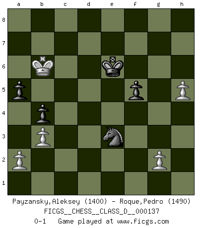Last move : 0-1 2010 April 2 22:11:56 [Event "FICGS__CHESS__CLASS_D__000137"] [Site "FICGS"] [Date "2009.12.12"] [Round "1"] [White "Payzansky,Aleksey"] [Black "Roque,Pedro"] [Result "0-1"] [WhiteElo "1400"] [BlackElo "1490"] 1.e4 e5 2.Nf3 Nc6 3.Bb5 a6 4.Ba4 Nf6 5.O-O Be7 6.Re1 b5 7.Bb3 d6 8.c3 O-O 9.h3 Na5 10.Bc2 c5 11.d4 Qc7 12.Nbd2 cxd4 13.cxd4 Nc6 14.Nf1 exd4 15.Bg5 Be6 16.Rc1 Qb6 17.Ng3 h6 18.Bf4 Rac8 19.e5 dxe5 20.Nxe5 Bb4 21.Nxc6 Rxc6 22.Bd2 Bxd2 23.Qxd2 Rfc8 24.Bb1 Rxc1 25.Rxc1 Rxc1+ 26.Qxc1 Qd6 27.b3 Nd5 28.Qc2 Nf4 29.Qh7+ Kf8 30.Qh8+ Ke7 31.Qxg7 d3 32.Bxd3 Qxd3 33.Qxh6 Qd2 34.Qg5+ Ke8 35.Qe5 Qxf2+ 36.Kxf2 Nd3+ 37.Ke3 Nxe5 38.Ne4 Ke7 39.h4 Bd5 40.Nc5 a5 41.Kd4 Kd6 42.Ne4+ Bxe4 43.Kxe4 Ke6 44.Kd4 b4 45.h5 Ng4 46.Kc5 Ne3 47.Kb6 f5 0-1 Ruy Lopez : Closed Kingside Castling by player White (move 5) Kingside Castling by player Black (move 8) 10 pieces endgame at move 43 : White KPPPP , Black KNPPP WHITE : King + 4 Pawns BLACK : King + 1 Knight 3 Pawns Player Black won this chess game. Follow this game move after move (download)Chess is a fighting game which is purely intellectual and includes chance. (Richard Reti) Alles was ich jemals tun will ist Schach spielen. (Robert James Fischer) A través de las casillas del tablero, los Indios explican el movimiento del tiempo y la edad, las influencias mas altas que controlan el mundo y los lazos que vinculan al Ajedrez con el alma humana. (Al-Masudi) Le système Elo représente seulement une moyenne. Il est simplement un indicateur de votre stabilité. (Anatoli Karpov) Pretend inferiority and encourage his arrogance. (Sun Tzu)