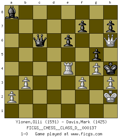 Last move : 1-0 2010 April 29 22:38:58 [Event "FICGS__CHESS__CLASS_D__000137"] [Site "FICGS"] [Date "2009.12.12"] [Round "1"] [White "Ylonen,Olli"] [Black "Davis,Mark"] [Result "1-0"] [WhiteElo "1591"] [BlackElo "1425"] 1.e4 c5 2.Nf3 Nc6 3.d4 cxd4 4.Nxd4 g6 5.Nxc6 bxc6 6.Nc3 Bg7 7.Bc4 e6 8.Be3 Ne7 9.Qd2 O-O 10.O-O Bb7 11.Bd3 d5 12.exd5 cxd5 13.Ne2 Nc6 14.Bf4 Rb8 15.Bxb8 Qxb8 16.Rab1 Ne5 17.b3 Rd8 18.h3 Nxd3 19.Qxd3 Re8 20.c4 dxc4 21.Qxc4 Rc8 22.Qf4 Be5 23.Qe3 Bh2+ 24.Kh1 Bc7 25.Rbc1 Bb6 26.Rxc8+ Qxc8 27.Qc3 Qa8 28.Qg3 Ba6 29.Re1 Qe4 30.Qf4 Qc2 31.Nd4 Bxd4 32.Qxd4 Bb7 33.Qxa7 Qc6 34.f3 Kg7 35.Qd4+ Kh6 36.Kh2 Ba8 37.Qe4 Qe8 38.Qe5 Qc6 39.Re4 g5 40.Qf6+ Kh5 41.g4+ Kh4 42.Qh6+ 1-0 Sicilian : Accelerated Fianchetto, Exchange variation Kingside Castling by player Black (move 9) Kingside Castling by player White (move 10) Player White won this chess game. Follow this game move after move (download)After black's reply to 1.e4 with 1..e5, leaves him always trying to get into the game. (Howard Staunton) Wer der Ansicht ist, daß alle Schachspieler verrückt sind, wird durch Studium des Lebens von Emil Josef Diemer nicht auf andere Gedanken kommen. (Hans Ree) El Ajedrez, como cualquier actividad creativa, solo puede existir a través del esfuerzo combinado de aquellos que tienen talento creativo y de aquellos que poseen la habilidad de organizar su trabajo creativo. (Mikhail Botvinnik) J'ai toujours senti une vague pitié pour l'homme qui ne connaît rien aux échecs, tout comme j'en aurais pour un homme ignorant de l'amour. Les Echecs, comme la musique ou comme l'amour, ont le pouvoir de rendre heureux. (Siegbert Tarrasch) The leaves of memory seemed to make a mournful rustling in the dark. (Henry Wadsworth Longfellow)