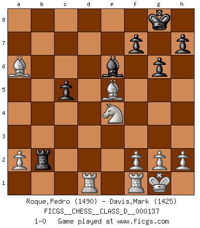 Last move : 1-0 2010 April 18 8:16:28 [Event "FICGS__CHESS__CLASS_D__000137"] [Site "FICGS"] [Date "2009.12.12"] [Round "1"] [White "Roque,Pedro"] [Black "Davis,Mark"] [Result "1-0"] [WhiteElo "1490"] [BlackElo "1425"] 1.Nf3 d5 2.c4 Nc6 3.cxd5 Qxd5 4.Nc3 Qd8 5.d4 g6 6.e4 Bg7 7.Bb5 e6 8.d5 exd5 9.exd5 Qe7+ 10.Be3 Nf6 11.dxc6 O-O 12.O-O a6 13.Bd3 Be6 14.cxb7 Rab8 15.Bxa6 c5 16.Bf4 Rxb7 17.Bd6 Qd7 18.Ne5 Rxb2 19.Nxd7 Rd8 20.Nxf6+ Bxf6 21.Ne4 Be5 22.Bxe5 Rxd1 23.Raxd1 1-0 Reti Opening Kingside Castling by player Black (move 11) Kingside Castling by player White (move 12) Player White won this chess game. Follow this game move after move (download)You sit at the board and suddenly your heart leaps. Your hand trembles to pick up the piece and move it. But what Chess teaches you is that you must sit there calmly and think about whether it's really a good idea and whether there are other better ideas. (Stanley Kubrick) Moralische Siege zählen nicht. (Savielly Grigorievitsch Tartakower) Tu cuerpo tiene que estar en óptima condición. Tu Ajedrez se deteriora como lo hace tu cuerpo. No puedes separar la mente y el cuerpo. (Bobby Fischer) Les Echecs ne sont pas pour les âmes timides. Ils requièrent un homme entier, qui ne s'arrête pas aveuglément à ce qui a été déjà établi, mais qui tente individuellement de sonder les profondeurs du jeu. (W. Steinitz) Bobby never cared about money, though. His only desire was to prove that his choices were correct: He wanted chess to be important because he was a chess player, and he wanted to be important. Bobby knew money was important, but he didn't have a clue why, outside of clothes and status. The only way he could accomplish what he wanted was to fight for a lot of money. Once he got it, he gave it away. He did not know how to spend it. And once he'd become champion, after, essentially, sacrificing his life for it, he didn't know how to spend his time. (Bob Wade)