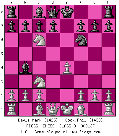 Last move : 1-0 2010 January 24 20:23:52 [Event "FICGS__CHESS__CLASS_D__000137"] [Site "FICGS"] [Date "2009.12.12"] [Round "1"] [White "Davis,Mark"] [Black "Cook,Phil"] [Result "1-0"] [WhiteElo "1425"] [BlackElo "1430"] 1.e4 e5 2.Nf3 Nf6 3.Nc3 Nc6 4.d4 exd4 5.Nxd4 Bb4 6.Nxc6 1-0 This chess game has been lost on time (started : 2009.12.12 21:40:20) Petrov Three knights game Player White won this chess game. Follow this game move after move (download)Discovered check is the dive bomber of the Chessboard. (Reuben Fine) Er war ein guter Schachspieler, aber ich kann Leute nicht ausstehen, die 'Heil Hitler' rufen (Über Alexander Aljechin). (Miguel Najdorf) El Ajedrez es el juego mas altamente simbólico, pero las agresiones estan por lo tanto aún mas francamente representadas en la partida. Tal vez comenzo como un juego de guerra; Algo como la representación de una batalla en miniatura entre las fuerzas de dos reinos. (Karl Meninger) On n'a jamais que l'âge auquel on a commence à jouer aux échecs car après on cesse de vieillir. (Capablanca) Perseverance does not equal worthiness. Next time you want to get my attention, wear something fun. Low-riding jeans are hot. (Gregory House, House M.D.)