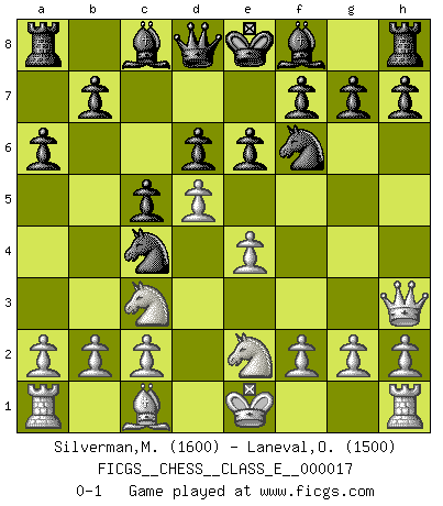 Last move : 0-1 2006 December 9 17:43:0 [Event "FICGS__CHESS__CLASS_E__000017"] [Site "FICGS"] [Date "2006.10.07"] [Round "1"] [White "Silverman,Michael"] [Black "Laneval,Olivier"] [Result "0-1"] [WhiteElo "1600"] [BlackElo "1500"] 1.e4 c5 2.Bc4 d6 3.Qf3 e6 4.Nc3 Nf6 5.Nge2 a6 6.d4 Nbd7 7.d5 Ne5 8.Qh3 Nxc4 0-1 Sicilian defense Player Black won this chess game. Follow this game move after move (download)On the chessboard, lies and hypocrisy do not survive long. (Emanuel Lasker) Ich verstehe Aljechins Kombinationen ganz gut; aber woher er diese Angriffschancen bekommt und wie er die Eröffnung behandelt das ist für mich ein Buch mit sieben Siegeln. (Rudolf Spielmann) Fischer era un maestro de claridad y un Rey del posicionamiento astuto. Sus oponentes podían ver hacia donde se dirigía pero eran impotentes para detenerlo. (Bruce Pandolfini) Les échecs sont un jeu par leur forme, un art par leur essence et une science par sa difficulté d'acquisition. Ils peuvent vous procurer autant de plaisir qu'un bon livre ou une belle musique, mais vous n'aurez une réelle joie que si vous arrivez à bien jouer. (Tigran Petrosian) You know what they say : You lie down with the Devil, you wake up in Hell. (Horatio Caine, C.S.I. Miami)