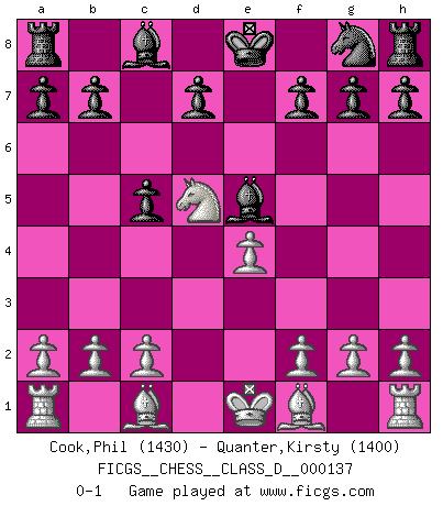 Last move : 0-1 2010 January 22 20:22:33 [Event "FICGS__CHESS__CLASS_D__000137"] [Site "FICGS"] [Date "2009.12.12"] [Round "1"] [White "Cook,Phil"] [Black "Quanter,Kirsty"] [Result "0-1"] [WhiteElo "1430"] [BlackElo "1400"] 1.Nf3 Nc6 2.Nc3 e5 3.d4 exd4 4.Nxd4 Nxd4 5.Qxd4 c5 6.Qe5+ Qe7 7.Qxe7+ Bxe7 8.Nd5 Bd6 9.e4 Be5 0-1 This chess game has been lost on time (started : 2009.12.12 21:40:20) Reti Opening Player Black won this chess game. Follow this game move after move (download)It is not a move, even the best move that you must seek, but a realizable plan. (Eugene Znosko-Borovsky) Dass jemand wie Surab Asmaiparaschwili, der selbst Elopunkte gekauft hat , Vize-Präsident der Fide werden konnte, sagt schon einges über den Zustand dieser Organisation aus. (Joel Lautier) Una de estas pequeñas movidas modestas pudieran ser mas molestas a tu oponente que la amenaza mas grande. (Siegbert Tarrasch) L'action d'une oeuvre littéraire se déroule sur un champ de bataille. Les masques et les types du drame moderne correspondent aux pièces du jeu d'échecs. L'intrigue correspond aux coups et aux gambits, c'est à dire aux techniques du jeu telles qu'utilisées et interprétées par les joueurs. Les tactiques et les péripéties [mouvements] correspondent aux coups exécutés par l'adversaire. (Viktor Shklovsky) Quotation,n.: The act of repeating erroneously the words of another. The words erroneously repeated. (Ambrose Bierce, The Devil's Dictionary)