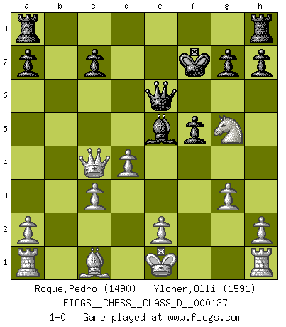 Last move : 1-0 2010 April 3 12:2:23 [Event "FICGS__CHESS__CLASS_D__000137"] [Site "FICGS"] [Date "2009.12.12"] [Round "1"] [White "Roque,Pedro"] [Black "Ylonen,Olli"] [Result "1-0"] [WhiteElo "1490"] [BlackElo "1591"] 1.c4 e5 2.g3 Nf6 3.Nc3 d5 4.cxd5 Nxd5 5.Bg2 Nxc3 6.bxc3 f5 7.Nh3 Be6 8.Bxb7 Bd5 9.Qa4+ Bc6 10.Bxc6+ Nxc6 11.Qxc6+ Kf7 12.f4 Bd6 13.fxe5 Bxe5 14.d4 Qd6 15.Qc4+ Qe6 16.Ng5+ 1-0 English Opening Player White won this chess game. Follow this game move after move (download)Bobby is the finest Chess player this country ever produced. His memory for the moves, his brilliance in dreaming up combinations, and his fierce determination to win are uncanny. (John Collins) Der Traum, für den ich lebe, ist der von einem freien Russland. Viele mögen sagen: Russland hat doch ein Parlament, einen gewählten Präsidenten. Aber ich spüre, dass in meiner Heimat die Angst wiederkehrt. Eine Angst, sich frei zu äußern, bestimmte Dinge zu tun (Garry Kasparov) Sin errores no puede haber brillantez. (Emanuel Lasker) Les Echecs mettent en conflit, non pas deux intelligences, mais deux volontés. (Lasker) Computer Science is no more about computers than astronomy is about telescopes. (Edsger W. Dijkstra)