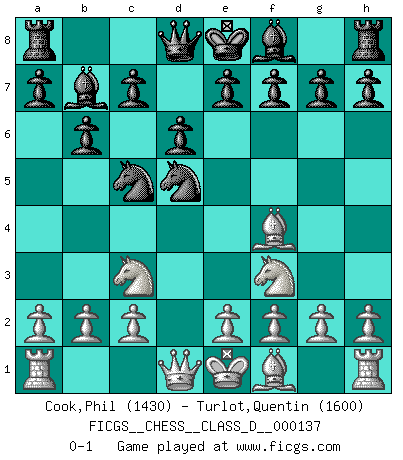 Last move : 0-1 2010 January 24 20:23:52 [Event "FICGS__CHESS__CLASS_D__000137"] [Site "FICGS"] [Date "2009.12.12"] [Round "1"] [White "Cook,Phil"] [Black "Turlot,Quentin"] [Result "0-1"] [WhiteElo "1430"] [BlackElo "1600"] 1.d4 Nf6 2.Bf4 b6 3.Nc3 Bb7 4.Qd3 d6 5.d5 Nbd7 6.Nf3 Nc5 7.Qd1 Nxd5 0-1 This chess game has been lost on time (started : 2009.12.12 21:40:20) Queen's pawn game Player Black won this chess game. Follow this game move after move (download)First-class players lose to second class players because second-class players sometimes play a first-class game. (Tarrasch) Die FIDE ist dabei in die Hände der russischen Mafia zu fallen. (Larry Evans) Te sientas frente a un tablero y repentinamente tu corazón brinca. Tu mano tiembla al tomar una pieza y moverla. Pero lo que el Ajedrez te enseña es que tu debes permanecer ahí con calma y pensar de que si realmente es una buena idea o de que si hay otras ideas mejores. (Stanley Kubrick) Nous vivons dans un monde échiquéen : chaque jour qui passe est un défi à relever. (Philosophe Sasha) Wisdom begins at the end. (Daniel Webster)