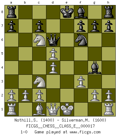 Last move : 1-0 2006 December 10 5:47:54 [Event "FICGS__CHESS__CLASS_E__000017"] [Site "FICGS"] [Date "2006.10.07"] [Round "1"] [White "Nothill,Steven"] [Black "Silverman,Michael"] [Result "1-0"] [WhiteElo "1400"] [BlackElo "1600"] 1.e4 e5 2.Nf3 Nc6 3.Bb5 d5 4.Nxe5 Qd6 5.Bxc6+ bxc6 6.d4 Qb4+ 7.Nc3 Nf6 8.Nxc6 Qd6 9.exd5 Bg4 10.f3 1-0 Ruy Lopez (Spanish Opening) Player White won this chess game. Follow this game move after move (download)You need not play well - just help your opponent to play badly. (Genrikh Chepukaitis) Ich verachte Kasparow. (Viktor Kortschnoi) El Ajedrez detiene a su maestro dentro de sus propios vínculos, encadenando la mente y el cerebro, por lo que la libertad interior del mas fuerte debe sufrir. (Albert Einstein) Le génie consiste à savoir transgresser les règles au moment opportun. (Teichmann) The arrogant army will lose certainly the battle. (Chinese proverb)