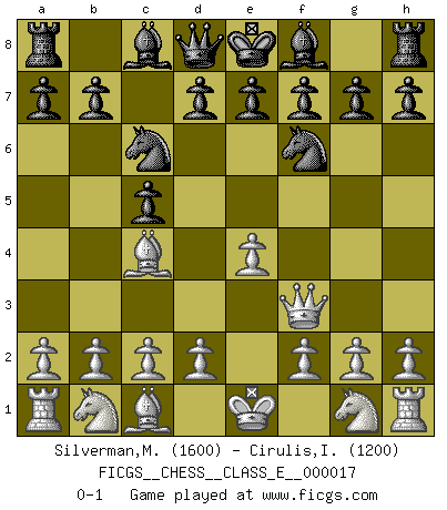 Last move : 0-1 2006 December 18 12:52:58 [Event "FICGS__CHESS__CLASS_E__000017"] [Site "FICGS"] [Date "2006.10.07"] [Round "1"] [White "Silverman,Michael"] [Black "Cirulis,Ilmars"] [Result "0-1"] [WhiteElo "1600"] [BlackElo "1200"] 1.e4 c5 2.Bc4 Nc6 3.Qf3 Nf6 0-1 This chess game has been lost on time (started : 2006.10.07 16:14:37) Sicilian defense Player Black won this chess game. Follow this game move after move (download)The winner of the game is the player who makes the next-to-last mistake. (Savielly Tartakover) Mit Schach schule ich mein Gefühl für Geometrie, was für Tennis und Schach gleichermaßen wichtig ist. (Boris Becker) Un mal plan es mejor que no tener ningún plan. (Frank Marshall) Toutes choses étant égales, c'est la conviction qui gagne. Alliée à une volonté de vaincre, elle sert de détonateur, suscite des idées, disperse les doutes et aide à penser clairement. (Robert Fischer) Train yourself to let go of everything you fear to lose. (Master Yoda in Star Wars ep.3)
