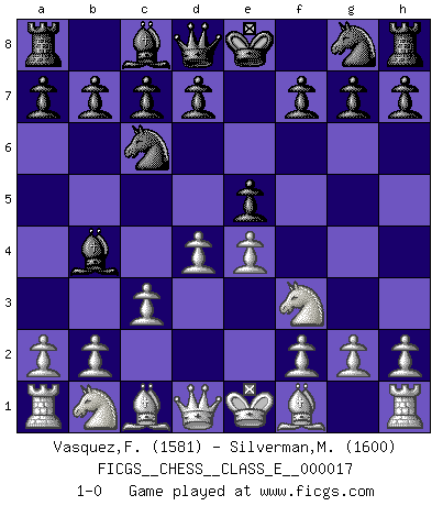 Last move : 1-0 2006 December 10 23:50:22 [Event "FICGS__CHESS__CLASS_E__000017"] [Site "FICGS"] [Date "2006.10.07"] [Round "1"] [White "Vasquez,Fernando"] [Black "Silverman,Michael"] [Result "1-0"] [WhiteElo "1581"] [BlackElo "1600"] 1.e4 e5 2.Nf3 Nc6 3.d4 Bb4+ 4.c3 1-0 Scotch Opening Player White won this chess game. Follow this game move after move (download)There's never before been a Chess player with such a thorough knowledge of the intricacies of the game and such an absolutely indomitable will to win. I think Bobby is the greatest player that ever lived. (Lisa Lane) Das ganze Leben mit einer Ehefrau ist wie ein Endspiel mit ungleichfarbigen Läufern. (Viktor Kortschnoi) Dios mío, Bobby Fischer juega tan simple. (Alexei Suetin) Il (Jacob Murray) ne joue pas pour le bon coup, mais pour le meilleur. (Eloi Relange) We need strong personalities and only one world champion to attract sponsors. (Anatoly Karpov)
