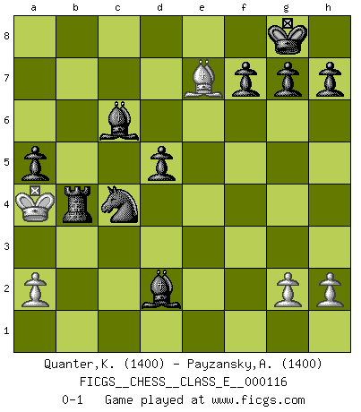 Last move : 0-1 2009 December 16 18:18:0 [Event "FICGS__CHESS__CLASS_E__000116"] [Site "FICGS"] [Date "2009.12.15"] [Round "1"] [White "Quanter,Kirsty"] [Black "Payzansky,Aleksey"] [Result "0-1"] [WhiteElo "1400"] [BlackElo "1400"] 1.b3 e5 2.Bb2 d6 3.Na3 Nf6 4.e3 Be7 5.d4 exd4 6.exd4 O-O 7.c4 d5 8.c5 c6 9.Bd3 b6 10.Rc1 Re8 11.Ne2 bxc5 12.dxc5 Nbd7 13.b4 Rb8 14.Qd2 a5 15.Nd4 Bxc5 16.Kd1 Bxb4 17.Qf4 Ne5 18.Nxc6 Nxd3 19.Qxb8 Nxf2+ 20.Kc2 Bf5+ 21.Kb3 Qxb8 22.Nxb8 Rxb8 23.Rc6 Bd2 24.Ka4 Bd7 25.Rd1 Nxd1 26.Bxf6 Bxc6+ 27.Nb5 Rxb5 28.Be7 Nb2+ 29.Ka3 Nc4+ 30.Ka4 Rb4+ 0-1 Nimzovich-Larsen attack : Modern variation Kingside Castling by player Black (move 6) Player Black won this chess game. Follow this game move after move (download)Chess is above all, a fight ! (Emanuel Lasker) Das Schach ist nichts für kleine Geister, es beansprucht einen vollen Mann, der sich nicht sklavisch an das Überlieferte hält, sondern selbständig die Tiefen des Spiels zu ergründen sucht. (Wilhelm Steinitz) Realmente no sabemos como el juego fue inventado, aunque hay sospechas. Tan pronto como descubramos a los culpables, se los haremos saber. (Bruce Pandolfini) Les Cavaliers se révèlent fort utiles dans les positions fermées. D'habitude, les Fous sont un peu plus forts que les Cavaliers dans les positions ouvertes. Qu'on le veuille ou non, il restera toujours des exceptions ! Luck is what you have left over after you give 100 percent. (Langston Coleman)
