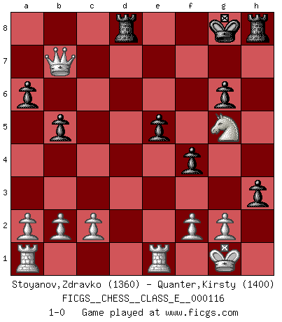 Last move : 1-0 2009 December 22 18:40:11 [Event "FICGS__CHESS__CLASS_E__000116"] [Site "FICGS"] [Date "2009.12.15"] [Round "1"] [White "Stoyanov,Zdravko"] [Black "Quanter,Kirsty"] [Result "1-0"] [WhiteElo "1360"] [BlackElo "1400"] 1.e4 c5 2.Nf3 Nc6 3.Bb5 Qc7 4.d3 a6 5.Bc4 b5 6.Bd5 Bb7 7.Nbd2 Nd4 8.Bxb7 Qxb7 9.Nxd4 cxd4 10.Nf3 d5 11.O-O dxe4 12.Nxd4 exd3 13.Qxd3 e5 14.Ne2 g6 15.Be3 Bh6 16.Bxh6 Nxh6 17.Qe3 Ng4 18.Qg3 f5 19.h3 h5 20.hxg4 f4 21.Qc3 Qe7 22.Qc6+ Kf7 23.Qd5+ Kg7 24.g5 h4 25.Rfe1 Qxg5 26.Nc3 Rad8 27.Qb7+ Kg8 28.Ne4 h3 29.Nxg5 1-0 Sicilian : Nimzovich-Rossolimo attack (without ...d6) Kingside Castling by player White (move 11) Player White won this chess game. Follow this game move after move (download)It is the aim of the modern school, not to treat every position according to one general law, but according to the principle inherent in the position. (Richard Reti) Alles was ich jemals tun will ist Schach spielen. (Robert James Fischer) El Ajedrez es un terrible juego. Si no controlas el centro, tu oponente tiene una posición mas holgada. Si tienes control del centro, ¡entonces realmente tu tienes algo de que preocuparte!. (Siegbert Tarrasch) Psychologiquement, tu dois avoir confiance en toi même, mais cette confiance doit être basée sur des faits. (Robert Fischer) Do you know these so called Volunteers don't even get paid! (Simpsons)