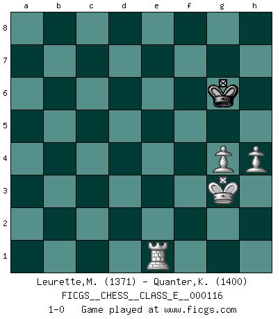 Last move : 1-0 2009 December 18 19:1:53 [Event "FICGS__CHESS__CLASS_E__000116"] [Site "FICGS"] [Date "2009.12.15"] [Round "1"] [White "Leurette,Marc-Antoine"] [Black "Quanter,Kirsty"] [Result "1-0"] [WhiteElo "1371"] [BlackElo "1400"] 1.e4 e5 2.Nf3 Nf6 3.Nc3 d5 4.exd5 Nxd5 5.Nxe5 Nxc3 6.bxc3 f6 7.Nf3 g5 8.Bc4 Bg4 9.O-O Nc6 10.Re1+ Be7 11.Rb1 b6 12.Bb5 Bd7 13.Nd4 Nxd4 14.Bxd7+ Qxd7 15.cxd4 Qxd4 16.Ba3 c5 17.Bb2 Qd6 18.d4 h5 19.dxc5 Qxc5 20.Bxf6 O-O 21.Bxe7 Qc7 22.Bxf8 Rxf8 23.Qxh5 Qxc2 24.Qxg5+ Kf7 25.Qe7+ Kg8 26.Qxa7 Qxf2+ 27.Kh1 Rf7 28.Qxb6 Qxa2 29.Qb3 Qa8 30.Rf1 Qe8 31.Rbe1 Qd7 32.Kg1 Kg7 33.Qxf7+ Qxf7 34.Rxf7+ Kxf7 35.h4 Kg6 36.g4 Kh6 37.Kg2 Kg6 38.Kg3 1-0 Petrov Three knights game Kingside Castling by player White (move 9) Kingside Castling by player Black (move 20) 10 pieces endgame at move 28 : White KQRRPPP , Black KQR WHITE : King + 1 Queen 2 Rooks 3 Pawns BLACK : King + 1 Queen 1 Rook 9 pieces endgame at move 28 : White KQRRPP , Black KQR WHITE : King + 1 Queen 2 Rooks 2 Pawns BLACK : King + 1 Queen 1 Rook 8 pieces endgame at move 33 : White KQRRPP , Black KQ WHITE : King + 1 Queen 2 Rooks 2 Pawns BLACK : King + 1 Queen 7 pieces endgame at move 33 : White KRRPP , Black KQ WHITE : King + 2 Rooks 2 Pawns BLACK : King + 1 Queen 6 pieces endgame at move 34 : White KRRPP , Black K WHITE : King + 2 Rooks 2 Pawns BLACK : King + 5 pieces endgame at move 34 : White KRPP , Black K WHITE : King + 1 Rook 2 Pawns BLACK : King + Player White won this chess game. Follow this game move after move (download)Chess books should be used as we use glasses: to assist the sight, although some players make use of them as if they thought they conferred sight. (Jose Raul Capablanca) Wenn sie aufgeben, dann danke ich Ihnen für das Spiel (Eventualzug beim Fernschach). (Anonymous) El Ajedrez no es como la vida... ¡tiene reglas!. (Mark Pasternak) Je fais ceci parce que dans cinquante coups j'obtiendrai cela; je m'appelle Mikhail Moisevitch Botvinnik. (Botvinnik) I live to kill Traxler counterattack. (Ilmars Cirulis)