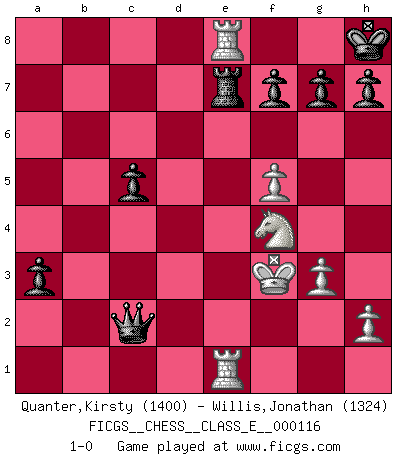 Last move : 1-0 2010 March 16 12:56:0 [Event "FICGS__CHESS__CLASS_E__000116"] [Site "FICGS"] [Date "2009.12.15"] [Round "1"] [White "Quanter,Kirsty"] [Black "Willis,Jonathan"] [Result "1-0"] [WhiteElo "1400"] [BlackElo "1324"] 1.e4 Nc6 2.d4 e5 3.dxe5 Nxe5 4.f4 Ng6 5.f5 Ne5 6.Be3 Nf6 7.Nc3 Bb4 8.Nge2 O-O 9.a3 Ba5 10.b4 Bb6 11.Bxb6 axb6 12.Nf4 c5 13.Ncd5 Nxe4 14.bxc5 bxc5 15.Bd3 Qa5+ 16.Kf1 d6 17.Bxe4 Bd7 18.Rb1 b5 19.Ne7+ Kh8 20.Bxa8 Qxa8 21.Qxd6 Qe4 22.Qd2 b4 23.Re1 Qc4+ 24.Re2 bxa3 25.g3 Bb5 26.Ke1 Nf3+ 27.Kf2 Nxd2 28.Rxd2 Re8 29.Re1 Qc3 30.R2d1 Qxc2+ 31.Kf3 Rxe7 32.Rd8+ Be8 33.Rxe8+ 1-0 KP : Nimzovich defense Kingside Castling by player Black (move 8) Player White won this chess game. Follow this game move after move (download)After black's reply to 1.e4 with 1..e5, leaves him always trying to get into the game. (Howard Staunton) Jeder leidlich begabte Spieler, er braucht keineswegs hervorragend veranlagt zu sein, kann es zum Meister bringen. Aber das ist ja auch gar nicht nötig! Der richtige Standpunkt ist es, zu seinem Vergnügen zu spielen, und man glaube ja nicht, dass der Genuss proportional dem Können sei. (Siegbert Tarrasch) Antes de los Finales, los dioses han colocado el Juego Medio. (Siegbert Tarrasch) Les échecs, c'est l'imagination. (David Bronstein) Don't be irreplaceable, if you can't be replaced, you can't be promoted. (Dan Rotaru)