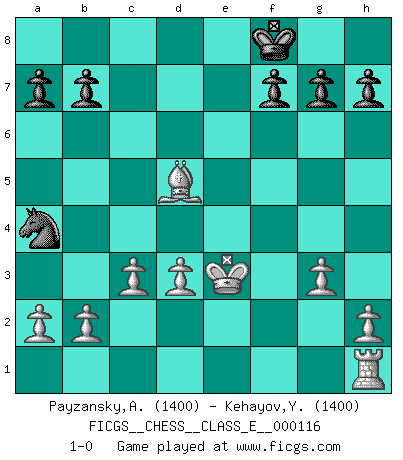 Last move : 1-0 2009 December 15 11:55:8 [Event "FICGS__CHESS__CLASS_E__000116"] [Site "FICGS"] [Date "2009.12.15"] [Round "1"] [White "Payzansky,Aleksey"] [Black "Kehayov,Yulian"] [Result "1-0"] [WhiteElo "1400"] [BlackElo "1400"] 1.e4 e5 2.Nf3 Nf6 3.Nxe5 Bd6 4.Nc4 Nxe4 5.d3 Nf6 6.Nxd6+ cxd6 7.Qe2+ Qe7 8.Qxe7+ Kxe7 9.Nc3 Re8 10.Nb5 Kf8 11.Be3 Na6 12.Nxd6 Re6 13.Nxc8 Rxc8 14.c3 Nd5 15.Kd2 Nxe3 16.fxe3 d5 17.g3 Rce8 18.Re1 Nc5 19.Bg2 Na4 20.Bxd5 Rxe3 21.Rxe3 Rxe3 22.Kxe3 1-0 Petrov's defense Player White won this chess game. Follow this game move after move (download)My opponents make good moves too. Sometimes I don't take these things into consideration. (Bobby Fischer) Es ist im Leben wie im Schachspiel. Wir entwerfen einen Plan, dieser bleibt jedoch bedingt durch das, was im Schachspiel dem Gegner, im Leben dem Schicksal zu tun belieben wird. (Arthur Schopenhauer) El juego de Damas es para vagabundos. (Paul Morphy) Avec des compensations pour le matériel en plus... (Anonyme) We need strong personalities and only one world champion to attract sponsors. (Anatoly Karpov)