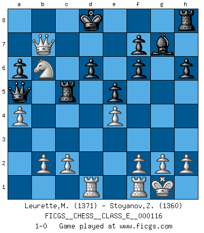 Last move : 1-0 2009 December 19 21:30:27 [Event "FICGS__CHESS__CLASS_E__000116"] [Site "FICGS"] [Date "2009.12.15"] [Round "1"] [White "Leurette,Marc-Antoine"] [Black "Stoyanov,Zdravko"] [Result "1-0"] [WhiteElo "1371"] [BlackElo "1360"] 1.e4 c5 2.Nc3 a6 3.Nf3 Nc6 4.Bc4 e6 5.d4 cxd4 6.Nxd4 Nxd4 7.Qxd4 d6 8.Bd2 e5 9.Qd5 Be6 10.Qxb7 Bxc4 11.Qc6+ Ke7 12.Qxc4 Nf6 13.Bg5 h6 14.Nd5+ Kd7 15.Bxf6 gxf6 16.O-O Bg7 17.Rad1 Qa5 18.a4 Rac8 19.Qb4 Rc5 20.Qb7+ Kd8 21.Nb6 1-0 Sicilian : Closed Kingside Castling by player White (move 16) Player White won this chess game. Follow this game move after move (download)Adequate compensation for a sacrifice is having a sound combination leading to a winning position; adequate compensation for a blunder is having your opponent snatch defeat from the jaws of victory. (Bruce A. Moon) Irgendwie scheint mir sonntags früh um 9 Uhr der Killerinstinkt verloren gegangen zu sein. (Alexej Shirov) Cada Peón es una Reina en potencia. (James Mason) Les pièces de l'échiquier étaient impitoyables. Elles le retenaient, elles l'absorbaient. Il y avait de l'horreur en cela, mais aussi une harmonie unique. Car, qu'y a-t-il dans le monde, à part les échecs ? (V. Nabokov) The weakness of an artist is dogma. (Josh Waitzkin)