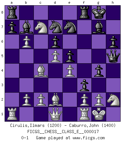 Last move : 0-1 2007 March 4 12:28:16 [Event "FICGS__CHESS__CLASS_E__000017"] [Site "FICGS"] [Date "2006.10.07"] [Round "1"] [White "Cirulis,Ilmars"] [Black "Caburro,John"] [Result "0-1"] [WhiteElo "1200"] [BlackElo "1400"] 1.e4 g6 2.Nc3 Bg7 3.d4 b6 4.Nf3 Bb7 5.Bc4 e6 6.O-O Ne7 7.Bg5 d6 8.d5 e5 9.h4 h6 10.Be3 O-O 11.h5 g5 12.a4 f5 13.a5 f4 14.Bd2 Qe8 15.Nb5 Qxh5 16.Nxc7 g4 17.Nh2 f3 18.axb6 Nd7 0-1 This chess game has been lost on time (started : 2006.10.07 16:14:37) Robatsch (Modern) defense Kingside Castling by player White (move 6) Kingside Castling by player Black (move 10) Player Black won this chess game. Follow this game move after move (download)Many Chess players were surprised when after the game, Fischer quietly explained: 'I had already analyzed this possibility' in a position which I thought was not possible to foresee from the opening. (Mikhail Tal) Die Idee von Capablanca, Schach als Fach in den Schulen zu lehren, ist großartig. (Fidel Castro) Bendita sea la memoria de aquel que dio al mundo este juego inmortal. (A. G. Gardiner) A ce moment-là, je menaçais de comprendre la position ! (Clément L'Heureux) It's only after you lost everything, Tyler says, that you're free to do anything. (Chuck Palahniuk, Fight Club)