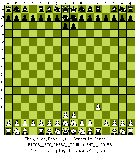 Last move : 1-0 2010 January 14 20:17:22 [Event "FICGS__BIG_CHESS__TOURNAMENT__000056"] [Site "FICGS"] [Date "2009.12.15"] [Round "1"] [White "Thangaraj,Prabu"] [Black "Sarraute,Benoit"] [Result "1-0"] [WhiteElo ""] [BlackElo ""] 1.m2-m4 1-0 This big chess game has been lost on time (started : 2009.12.15 11:27:49) Follow this game move after move (download)The hallmark of the artist is simplicity. (Larry Evans) Kostenjuk hat keinen Sexappeal. (Loek van Wely) Bobby Fischer es el jugador de Ajedrez mas grande que jamás haya existido. (Ken Smith) Les échecs sont plus proches de l'art de l'assassinat que de l'art de la guerre. (Arturo Perez-Reverte) A mistake is only a mistake if you let it happen twice. Otherwise it is a learning experience. (Daniel Parmet)