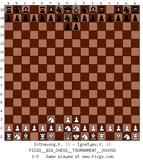 Last move : 1-0 2009 December 22 8:6:3 [Event "FICGS__BIG_CHESS__TOURNAMENT__000056"] [Site "FICGS"] [Date "2009.12.15"] [Round "1"] [White "Inthavong,Kiao"] [Black "Ignatyev,Vladimir"] [Result "1-0"] [WhiteElo ""] [BlackElo ""] 1.g1-f3 1-0 Follow this game move after move (download)Chess is a fairy tale of 1001 blunders. (Savielly Tartakower) Wenn Du einsam bist, wenn Du Dich in der Welt wie ein Fremder fühlst, spiele Schach. Das wird Deinen Geist erheben und Dein Ratgeber im Kampf sein. (Aristoteles) Por tratar de evitar la pérdida de una pieza, muchas personas han perdido una partida de Ajedrez. (Savielly Tartakover) La conception d'un plan est le processus par lequel un joueur exploite les avantages de sa position tout en s'efforçant d'en réduire au minimum les inconvénients. Afin de garantir le succès, un plan doit toujours se fonder sur un diagnostic objectif des particularités d'une position. La conception d'un plan est d'autant plus difficile que la position est équilibrée, et grandement facilitée lorsqu'il n'existe qu'un seul plan susceptible de répondre aux exigences de la position. (Harry Golombek) Humor is by far the most significant activity of the human brain. (Edward De Bono)