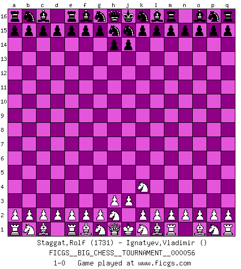 Last move : 1-0 2009 December 15 13:45:56 [Event "FICGS__BIG_CHESS__TOURNAMENT__000056"] [Site "FICGS"] [Date "2009.12.15"] [Round "1"] [White "Staggat,Rolf"] [Black "Ignatyev,Vladimir"] [Result "1-0"] [WhiteElo "1731"] [BlackElo ""] 1.j2-k4 1-0 Follow this game move after move (download)It was clear to me that the vulnerable point of the American Grandmaster (Bobby Fischer) was in double-edged, hanging, irrational positions, where he often failed to find a win even in a won position. (Efim Geller) Es macht mich traurig, wenn ich sehe, dass Golfprofis mehr verdienen als Schachsportler. Obwohl ich davon überzeugt bin, dass wir Schachspieler viel härter trainieren müssen als die Golfer. (Alexandra Kosteniuk) Coloca el contenido del tablero de Ajedrez en un sombrero, agita las piezas vigorosamente, derrámalas en el tablero desde una altura de medio metro y así obtienes el estilo de Wilhelm Steinitz. (H. E. Bird) Des points faibles ou des trous dans la position de l'adversaire doivent être occupés par des pièces et non pas par des pions. (Siegbert Tarrasch) Internal peace cannot coexist with external war. (Don Groves)