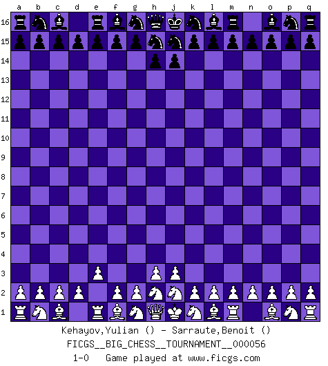 Last move : 1-0 2010 January 14 20:17:22 [Event "FICGS__BIG_CHESS__TOURNAMENT__000056"] [Site "FICGS"] [Date "2009.12.15"] [Round "1"] [White "Kehayov,Yulian"] [Black "Sarraute,Benoit"] [Result "1-0"] [WhiteElo ""] [BlackElo ""] 1.e2-e3 1-0 This big chess game has been lost on time (started : 2009.12.15 11:27:49) Follow this game move after move (download)If your opponent cannot do anything active, then don't rush the position; instead you should let him sit there, suffer, and beg you for a draw. (Jeremy Silman) Ich moechte nie einem Club beitreten, der Leute wie mich als Mitglieder aufnimmt. (Woody Allen) Si tu oponente no puede hacer nada activo, entonces no apures la posición; En vez de eso, dejalo estar sentado ahí, sufriendo y rogandote por un empate. (Jeremy Silman) Toutes les manuvres exécutées sur une colonne ouverte ont pour but ultime l'intrusion définitive sur la septième ou la huitième rangée, en plein cur de la position ennemie. (Aaron Nimzovitch) You cannot beat a roulette table unless you steal money from it. (Albert Einstein)