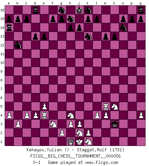 Last move : 0-1 2009 December 19 13:47:23 [Event "FICGS__BIG_CHESS__TOURNAMENT__000056"] [Site "FICGS"] [Date "2009.12.15"] [Round "1"] [White "Kehayov,Yulian"] [Black "Staggat,Rolf"] [Result "0-1"] [WhiteElo ""] [BlackElo "1731"] 1.e2-e4 j15-k13 2.m2-m3 h16-o10 3.p1-o3 o10-f2 4.h2-f3 n15-n13 5.e1-e2 f2-c5 6.c2-c3 m15-m13 7.d2-d4 c5-c7 8.e4-e5 l16-o13 9.n2-n3 d15-d13 10.m3-m4 c16-k9 11.b1-d2 e15-e13 12.d2-c4 c7-c4 13.j2-h4 k9-d3 14.b2-b3 c4-a6 15.c3-c4 d3-e2 16.f1-e2 o16-a3 17.c1-a3 a6-a3 18.l1-m2 a3-b2 19.g1-j2 b2-e2 20.k1-h2 e2-e4 21.m2-k4 b16-c14 22.o1-j6 f16-b12 23.k4-b12 c14-b12 24.o3-n5 o13-h7 25.j6-h7 e4-h7 26.p2-p3 m16-m14 27.l2-l4 e16-e14 28.m1-m3 e14-a14 29.m3-k3 a16-d16 30.q2-q4 m14-o14 31.k3-k5 o14-o2 32.q1-p1 h7-o13 33.a2-a4 o2-o1 34.p1-o1 o13-o1 35.h2-k1 o1-q3 36.a1-e1 q3-p3 37.e1-e4 p3-n3 38.k5-m5 p16-o14 0-1 Follow this game move after move (download)The game of Chess is not merely an idle amusement; several very valuable qualities of the mind are to be acquired and strengthened by it, so as to become habits ready on all occasions; for life is a kind of Chess. (Benjamin Franklin) Das ganze Leben mit einer Ehefrau ist wie ein Endspiel mit ungleichfarbigen Läufern. (Viktor Kortschnoi) El Jaque al descubierto es el bombardero del tablero. (Reuben Fine) Je ne crois pas en la psychologie, je crois aux bons coups. (Robert Fischer) Players are not good because they find tactics, it is about the way to find the positions in which those tactics are hidden. (Luc-Olivier Leclerc)