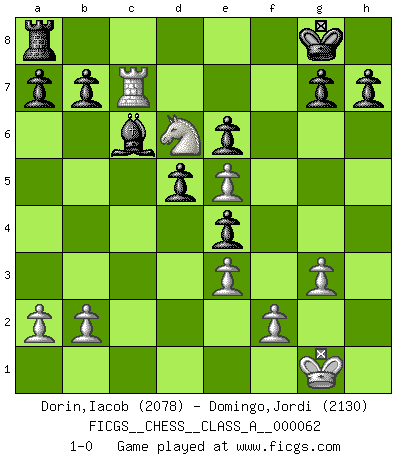 Last move : 1-0 2010 April 14 16:50:55 [Event "FICGS__CHESS__CLASS_A__000062"] [Site "FICGS"] [Date "2009.12.16"] [Round "1"] [White "Dorin,Iacob"] [Black "Domingo,Jordi"] [Result "1-0"] [WhiteElo "2078"] [BlackElo "2130"] 1.Nf3 f5 2.d4 Nf6 3.c4 e6 4.Nc3 d5 5.g3 c6 6.Bg2 Bd6 7.O-O O-O 8.Qb3 Nbd7 9.Bd2 Ne4 10.cxd5 cxd5 11.Be3 Nb6 12.Nb5 Bb8 13.Ne5 Bxe5 14.dxe5 Nc4 15.Bxe4 fxe4 16.Bc5 Nd2 17.Qc3 Nxf1 18.Bxf8 Nxg3 19.hxg3 Kxf8 20.Nd6 Kg8 21.Rc1 Bd7 22.Qc7 Qxc7 23.Rxc7 Bc6 24.e3 1-0 Reti v Dutch Kingside Castling by player White (move 7) Kingside Castling by player Black (move 7) Player White won this chess game. Follow this game move after move (download)Later, I began to succeed in decisive games. Perhaps because I realized a very simple truth: not only was I worried, but also my opponent. (Mikhail Tal) Über die Verhaftung Bobby Fischers: Warum es die Bush-Administration für nötig befindet einen 61 Jahre alten Mann zu hetzten, der für niemanden ausser sich selbste eine Gefahr darstellt ist ein Rätsel. (Nigel Short) No hay precio que no valga la pena por la cabellera del Rey enemigo. (Koblentz) Si rien de grave n'est détecté lors de l'analyse d'une position, on joue alors le coup. Seconde règle de Blumenfeld. Somewhere in the world there is an epigram for every dilemma. (Hendrik Willem van Loon)