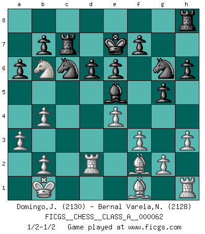 Last move : 1/2-1/2 2010 March 16 16:23:30 [Event "FICGS__CHESS__CLASS_A__000062"] [Site "FICGS"] [Date "2009.12.16"] [Round "1"] [White "Domingo,Jordi"] [Black "Bernal Varela,Nelson"] [Result "1/2-1/2"] [WhiteElo "2130"] [BlackElo "2128"] 1.e4 c5 2.Nf3 d6 3.d4 cxd4 4.Nxd4 Nf6 5.Nc3 a6 6.Be3 Ng4 7.Bg5 h6 8.Bh4 g5 9.Bg3 Bg7 10.h3 Ne5 11.f3 Nbc6 12.Bf2 Be6 13.Qd2 Rc8 14.O-O-O Qa5 15.Nb3 Bxb3 16.cxb3 Ng6 17.Kb1 Be5 18.Nd5 Qxd2 19.Rxd2 e6 20.Nb6 Rc7 21.a3 Ke7 22.b4 Na7 23.Nc4 Nc6 24.Nb6 1/2-1/2 Sicilian : Najdorf, Byrne (English) attack Queenside Castling by player White (move 14) This chess game ended in a draw. Follow this game move after move (download)I had a toothache during the first game. In the second game I had a headache. In the third game it was an attack of rheumatism. In the fourth game, I wasn't feeling well. And in the fifth game? Well, must one have to win every game ? (Siegbert Tarrasch) Deine Wertungszahl - vorausgesetzt einige Jahre schachliche Anstrengung - entspricht etwa dem zehnfachen Deines IQ plus 1000. (Jonathan Levitt) ¿Se han dado cuenta de que Fischer casi nunca ha tenido piezas malas? El las intercambia y las piezas malas se quedan con sus oponenets. (Yuri Balashov) Horreur, mais aussi harmonie suprême : qu'y avait-il en effet au monde en dehors des échecs ? Le brouillard, l'inconnu, le non-être... (Vladimir Nabokov) Life is pleasant. Death is peaceful. It's the transition that's troublesome. (Isaac Asimov)