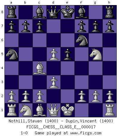 Last move : 1-0 2006 November 17 13:54:47 [Event "FICGS__CHESS__CLASS_E__000017"] [Site "FICGS"] [Date "2006.10.07"] [Round "1"] [White "Nothill,Steven"] [Black "Dupin,Vincent"] [Result "1-0"] [WhiteElo "1400"] [BlackElo "1400"] 1.e4 e5 2.Nf3 Nc6 3.Bc4 Nf6 4.Ng5 d5 5.exd5 Na5 6.d3 1-0 This chess game has been lost on time (started : 2006.10.07 16:14:37) Two knights defense : Kieseritsky variation Player White won this chess game. Follow this game move after move (download)There just isn't enough televised Chess. (David Letterman) Drei Punkte vor allen anderen ist wie einer, der im weißen Anzug posiert, während der Rest in Müllsäcke gekleidet dasteht. (Viktor Kortschnoi) ¿Se han dado cuenta de que Fischer casi nunca ha tenido piezas malas? El las intercambia y las piezas malas se quedan con sus oponenets. (Yuri Balashov) Le plus grand jeu de l'esprit jamais inventé, plus vous l'apprenez, plus vous y prenez du plaisir. (Garry Kasparov) Life is like internet, nothing interesting, but noone want to leave it. (Ilmars Cirulis)