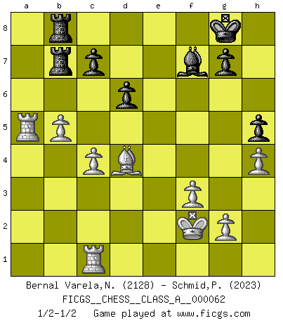 Last move : 1/2-1/2 2010 July 31 19:31:16 [Event "FICGS__CHESS__CLASS_A__000062"] [Site "FICGS"] [Date "2009.12.16"] [Round "1"] [White "Bernal Varela,Nelson"] [Black "Schmid,Pablo"] [Result "1/2-1/2"] [WhiteElo "2128"] [BlackElo "2023"] 1.e4 e5 2.Nf3 Nc6 3.Bb5 f5 4.d3 fxe4 5.dxe4 Nf6 6.O-O Bc5 7.Nc3 d6 8.Qd3 O-O 9.Qc4+ Kh8 10.Bxc6 bxc6 11.Nxe5 Qe8 12.Nd3 Bb6 13.Bg5 a5 14.Be3 Ba6 15.Qa4 c5 16.h3 Qxa4 17.Nxa4 Nxe4 18.Rfe1 Ba7 19.b3 Nf6 20.Rad1 Nd5 21.c4 Nb4 22.Nc3 Rae8 23.Nxb4 cxb4 24.Bxa7 bxc3 25.Be3 a4 26.Rc1 Kg8 27.Rxc3 axb3 28.axb3 Bc8 29.b4 Bf5 30.b5 Rb8 31.Kh2 h5 32.Ra1 Rb7 33.Ra5 Re8 34.Kg3 Reb8 35.h4 Bg6 36.f3 Bf7 37.Bd4 Rd8 38.Rc1 Rdb8 39.Kf2 Kh7 40.Kg3 Kg8 41.Kf2 Kh7 42.Rc2 Kg8 43.Kg3 Kh8 44.Ra1 Re8 45.Kf2 Kg8 46.R2c1 Kh7 47.Ra6 Kg8 48.Ra5 Reb8 1/2-1/2 Ruy Lopez : Schliemann defense Kingside Castling by player White (move 6) Kingside Castling by player Black (move 8) This chess game ended in a draw. Follow this game move after move (download)A strong memory, concentration, imagination, and a strong will is required to become a great Chess player. (Bobby Fischer) Ja, jede Frau in Holland liebt mich bestimmt, und alle Männer hassen mich. (Loek van Wely) El ganar no lo es todo... pero el perder es nada. (Mednis) Votre seul travail dans les ouvertures est d'obtenir un milieu de partie jouable. (Lajos Portish) The absolute truth is the thing that makes people laugh. (Carl Reiner)