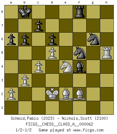 Last move : 1/2-1/2 2010 July 17 13:58:59 [Event "FICGS__CHESS__CLASS_A__000062"] [Site "FICGS"] [Date "2009.12.16"] [Round "1"] [White "Schmid,Pablo"] [Black "Nichols,Scott"] [Result "1/2-1/2"] [WhiteElo "2023"] [BlackElo "2100"] 1.e4 h5 2.d4 h4 3.Nc3 e6 4.Nf3 a6 5.Bd3 h3 6.gxh3 Rxh3 7.d5 e5 8.Nxe5 d6 9.Nf3 Bg4 10.Be2 Bxf3 11.Bxf3 Qh4 12.Rg1 Rxh2 13.Qe2 Nd7 14.Bg5 Qh8 15.Bf4 Rh4 16.Bg3 Rh6 17.O-O-O O-O-O 18.Kb1 g6 19.Rh1 Kb8 20.Bf4 Rxh1 21.Rxh1 Qg7 22.Be3 Be7 23.Qd2 Bf6 24.Nd1 Be5 25.Be2 f5 26.f4 Bf6 27.Bf2 fxe4 28.Qe3 Nb6 29.Qxe4 Qe7 30.Qxe7 Nxe7 31.c4 Re8 32.Bd3 g5 33.fxg5 Bxg5 34.Nc3 Nd7 35.Ne4 Ne5 36.Be2 Bf4 37.b3 b6 38.Rh4 Rf8 39.Kc2 N5g6 40.Rh5 Nf5 41.Rh1 Ne5 42.Rh3 Ng6 43.Rh5 Be5 44.Kd2 Bf4+ 45.Kc3 Be5+ 46.Kd2 Bf4+ 1/2-1/2 King's pawn Opening Queenside Castling by player White (move 17) Queenside Castling by player Black (move 17) This chess game ended in a draw. Follow this game move after move (download)It is no time to be playing Chess when the house is on fire. (Italian Proverb) Die Partien sind immer verschieden, die Interviews immer die gleichen. (Garry Kasparov) El Ajedrez no es una pizca de inferior al violín, y tenemos un gran número de violinistas profesionales. (Mikhail Botvinnik) Donnez-moi un Cavalier en 6e et je gagnerais toutes mes parties. (Steinitz) There is no vagueness without wind. (Chinese proverb)