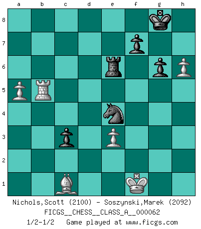 Last move : 1/2-1/2 2010 January 1 13:52:49 [Event "FICGS__CHESS__CLASS_A__000062"] [Site "FICGS"] [Date "2009.12.16"] [Round "1"] [White "Nichols,Scott"] [Black "Soszynski,Marek"] [Result "1/2-1/2"] [WhiteElo "2100"] [BlackElo "2092"] 1.h4 c5 2.h5 d5 3.c3 Nc6 4.d4 h6 5.dxc5 Nf6 6.Nf3 e5 7.b4 Qc7 8.e3 Be7 9.Be2 O-O 10.Bb2 Bg4 11.Ng1 Bxe2 12.Nxe2 b6 13.cxb6 axb6 14.a4 Rfd8 15.Na3 Qd7 16.Nb5 Ng4 17.Bc1 Na7 18.Nxa7 Rxa7 19.O-O Qf5 20.f3 Nf6 21.g4 Qd7 22.Ng3 e4 23.Ra2 exf3 24.Qxf3 Qe6 25.Nf5 d4 26.Rg2 dxc3 27.g5 hxg5 28.h6 Qe4 29.Rxg5 Qxf3 30.Rxf3 Rd1+ 31.Rf1 Rxf1+ 32.Kxf1 g6 33.Nxe7+ Rxe7 34.Rb5 Re6 35.a5 bxa5 36.bxa5 Ne4 1/2-1/2 Anti-Borg (Desprez) Opening Kingside Castling by player Black (move 9) Kingside Castling by player White (move 19) This chess game ended in a draw. Follow this game move after move (download)Pawn endings are to Chess what putting is to golf. (Cecil Purdy) Wenn es im Universum noch irgendwo intelligente Lebewesen gibt, dann kennen sie Go. (Emanuel Lasker) Bobby Fischer es el mas grande genio de Ajedrez de todos los tiempos. (Alexander Kotov) Il (Jacob Murray) ne joue pas pour le bon coup, mais pour le meilleur. (Eloi Relange) He who is a good ruler must first have been ruled. (Aristotle)