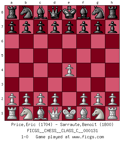 Last move : 1-0 2010 January 27 20:31:50 [Event "FICGS__CHESS__CLASS_C__000131"] [Site "FICGS"] [Date "2009.12.17"] [Round "1"] [White "Price,Eric"] [Black "Sarraute,Benoit"] [Result "1-0"] [WhiteElo "1704"] [BlackElo "1800"] 1.e4 1-0 This chess game has been lost on time (started : 2009.12.17 20:6:8) King's pawn Opening Player White won this chess game. Follow this game move after move (download)A player surprised is half beaten. (Proverb) Vom Schach wurde gesagt das Leben sei dafür nicht lange genug. Aber das ist der Fehler des Lebens, nicht des Schach'. (Irving Chernev) Aquellos que dicen entender al Ajedrez, no entienden nada. (Robert Hubner) A chaque perte on perd un peu de soi. (Joël Lautier) Creativity involves breaking out of established patterns in order to look at things in a different way. (Edward De Bono)