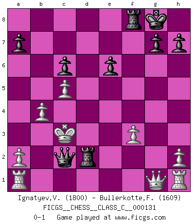 Last move : 0-1 2009 December 31 7:14:46 [Event "FICGS__CHESS__CLASS_C__000131"] [Site "FICGS"] [Date "2009.12.17"] [Round "1"] [White "Ignatyev,Vladimir"] [Black "Bullerkotte,Frank"] [Result "0-1"] [WhiteElo "1800"] [BlackElo "1609"] 1.e4 c6 2.d4 d5 3.e5 c5 4.dxc5 Nc6 5.f4 Bf5 6.c3 e6 7.Be3 Nh6 8.Nf3 Be7 9.Nbd2 O-O 10.b4 f6 11.Nd4 fxe5 12.Nxc6 bxc6 13.fxe5 Bg5 14.Qe2 Bg4 15.Nf3 Bxe3 16.Qxe3 Bxf3 17.gxf3 Qh4+ 18.Kd2 Nf5 19.Qg1 Qf4+ 20.Ke2 d4 21.Bh3 Qxe5+ 22.Kd3 dxc3 23.Bxf5 Rad8+ 24.Kc2 Rd2+ 25.Kb3 Qxf5 26.Kxc3 Qc2+ 0-1 Caro-Kann : Advance variation Kingside Castling by player Black (move 9) Player Black won this chess game. Follow this game move after move (download)Personally, I rather look forward to a computer program winning the world Chess Championship. Humanity needs a lesson in humility. (Richard Dawkings) Zu meiner Zeit war ein 20 jähriger ein junger Spieler, heute ist er ein Veteran. (Garry Kasparov) Las Aperturas te enseñan aperturas. ¡Los Finales te enseñan Ajedrez!. (Stephan Gerzadowicz) Le thème de l'attaque double intervient d'une manière ou d'une autre dans l'immense majorité des combinaisons. (Youri Averbakh) An expert is a man who has made all the mistakes which can be made in a very narrow field. (Niels Bohr)