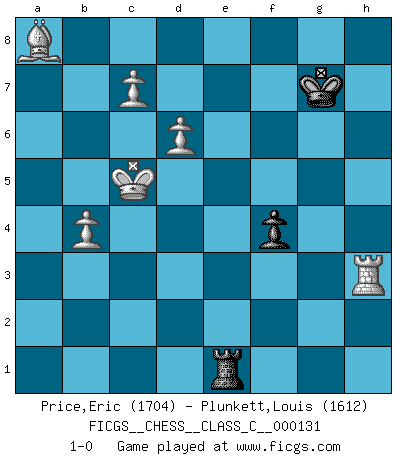 Last move : 1-0 2010 November 14 23:10:36 [Event "FICGS__CHESS__CLASS_C__000131"] [Site "FICGS"] [Date "2009.12.17"] [Round "1"] [White "Price,Eric"] [Black "Plunkett,Louis"] [Result "1-0"] [WhiteElo "1704"] [BlackElo "1612"] 1.e4 c5 2.Nf3 Nc6 3.d4 cxd4 4.Nxd4 g6 5.Nc3 Bg7 6.Be3 Nf6 7.f3 d6 8.Bc4 Qb6 9.Qd2 Ng4 10.fxg4 Bxd4 11.Bxd4 Nxd4 12.O-O-O Nc6 13.Nd5 Qd8 14.Qh6 Bxg4 15.Rdf1 Ne5 16.Bb3 Qd7 17.Nc3 O-O-O 18.Qe3 Kb8 19.Ba4 Qc8 20.Nd5 Nc4 21.Qf2 Ne5 22.Nxe7 Nd3+ 23.Kb1 Nxf2 24.Nxc8 Nxh1 25.Ne7 Be6 26.Rxh1 Rhf8 27.Nd5 Bxd5 28.exd5 Rc8 29.Re1 Rc7 30.c3 a6 31.Bb3 b5 32.a4 Rfc8 33.axb5 axb5 34.Re3 Rd8 35.Rf3 Re8 36.Rf6 Rd8 37.g4 Re7 38.h4 Re1+ 39.Kc2 Rd7 40.h5 gxh5 41.gxh5 Rh1 42.h6 Kc7 43.Ba2 Re7 44.Kb3 Rg1 45.Kb4 Rg6 46.Rf2 Rxh6 47.Kxb5 Rh1 48.b4 h5 49.c4 h4 50.c5 h3 51.Rf6 Kd8 52.Rxd6+ Ke8 53.c6 Ra1 54.Rh6 Kf8 55.Bc4 Kg7 56.Rxh3 Ra8 57.Kc5 f5 58.d6 Re5+ 59.Bd5 Re1 60.c7 f4 61.Bxa8 1-0 Sicilian : Accelerated Fianchetto, Modern variation Queenside Castling by player White (move 12) Queenside Castling by player Black (move 17) 10 pieces endgame at move 56 : White KRBPPP , Black KRRP WHITE : King + 1 Rook 1 Bishop 3 Pawns BLACK : King + 2 Rooks 1 Pawn 9 pieces endgame at move 61 : White KRBPPP , Black KRP WHITE : King + 1 Rook 1 Bishop 3 Pawns BLACK : King + 1 Rook 1 Pawn Player White won this chess game. Follow this game move after move (download)If one piece is badly posted, the whole game is bad. (Tarrasch) Ivan Sokolov treibt mich als Beifahrer an mit go Loeky go - . (Loek van Wely) Las leyes del Ajedrez no permiten una libre elección: tienes que mover quieras o no. (Emanuel Lasker) C'est la seule position que je connaisse où les deux camps sont mals. Propos prêtés à V. Anand. A clear conscience is usually the sign of a bad memory. (Unknown)