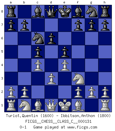 Last move : 0-1 2009 December 20 19:42:52 [Event "FICGS__CHESS__CLASS_C__000131"] [Site "FICGS"] [Date "2009.12.17"] [Round "1"] [White "Turlot,Quentin"] [Black "Ibbitson,Anthon"] [Result "0-1"] [WhiteElo "1600"] [BlackElo "1800"] 1.e4 c5 2.c4 Nc6 3.Nf3 e5 4.d3 d6 0-1 Sicilian defense Player Black won this chess game. Follow this game move after move (download)The sign of a great Master is his ability to win a won game quickly and painlessly. (Irving Chernev) Der 70jährige Viktor Kortschnoi: Die Rentenanstalt wollte mich zwingen in Rente zu gehen. Meine Frau erhält jetzt eine Pension- und ich zahle weiter in die Rentenkasse ein! (Viktor Kortschnoi) En un gambito tu regalas un Peón por el bién de tomar un juego perdido. (Samuel Standige Boden) Le pion, dans sa simplicité, marche droit devant lui, mais lorsqu'il prend, il le fait obliquement? Ainsi l'homme, tant qu'il reste pauvre, marche dans la droiture et vit honnêtement, mais lorsqu'il recherche les honneurs, il flatte, se parjure et, par les voies obliques, cherche une position supérieure sur l'échiquier du monde. (Jean de Galles) Tomorrow's what you make of it. (Horatio Caine, C.S.I. Miami)