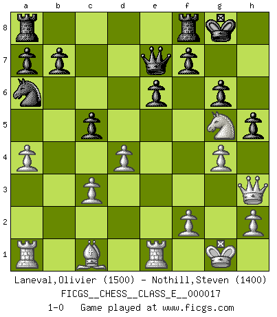 Last move : 1-0 2006 November 28 22:53:9 [Event "FICGS__CHESS__CLASS_E__000017"] [Site "FICGS"] [Date "2006.10.07"] [Round "1"] [White "Laneval,Olivier"] [Black "Nothill,Steven"] [Result "1-0"] [WhiteElo "1500"] [BlackElo "1400"] 1.d4 d5 2.c4 c6 3.Nc3 Nf6 4.Nf3 dxc4 5.a4 Bf5 6.e3 e6 7.Bxc4 Bb4 8.O-O O-O 9.Qb3 Qe7 10.Re1 c5 11.e4 Bxc3 12.bxc3 Bxe4 13.Ng5 Bd5 14.Bxd5 Nxd5 15.Qxd5 Na6 16.Qf5 g6 17.Qh3 h5 18.g4 1-0 QGD Slav defense Kingside Castling by player White (move 8) Kingside Castling by player Black (move 8) Player White won this chess game. Follow this game move after move (download)When you see a good move, look for a better one. (Emanuel Lasker) Der Freibauer hat für mich eine Seele, genau wie der Mensch, Wünsche, die unerkannt in ihm schlummern, und Befürchtungen, von deren Existenz er selbst kaum ahnt. (Aaron Nimzowitsch) Es el objetivo de la escuela moderna no tratar cada posición de acuerdo a una regla general, sino de acuerdo al principio inherente en la posición. (Richard Reti) On est toujours la mazette de quelqu'un d'autre. (Anonyme) Luck never made a man wise. (Seneca, Letters to Lucilius)